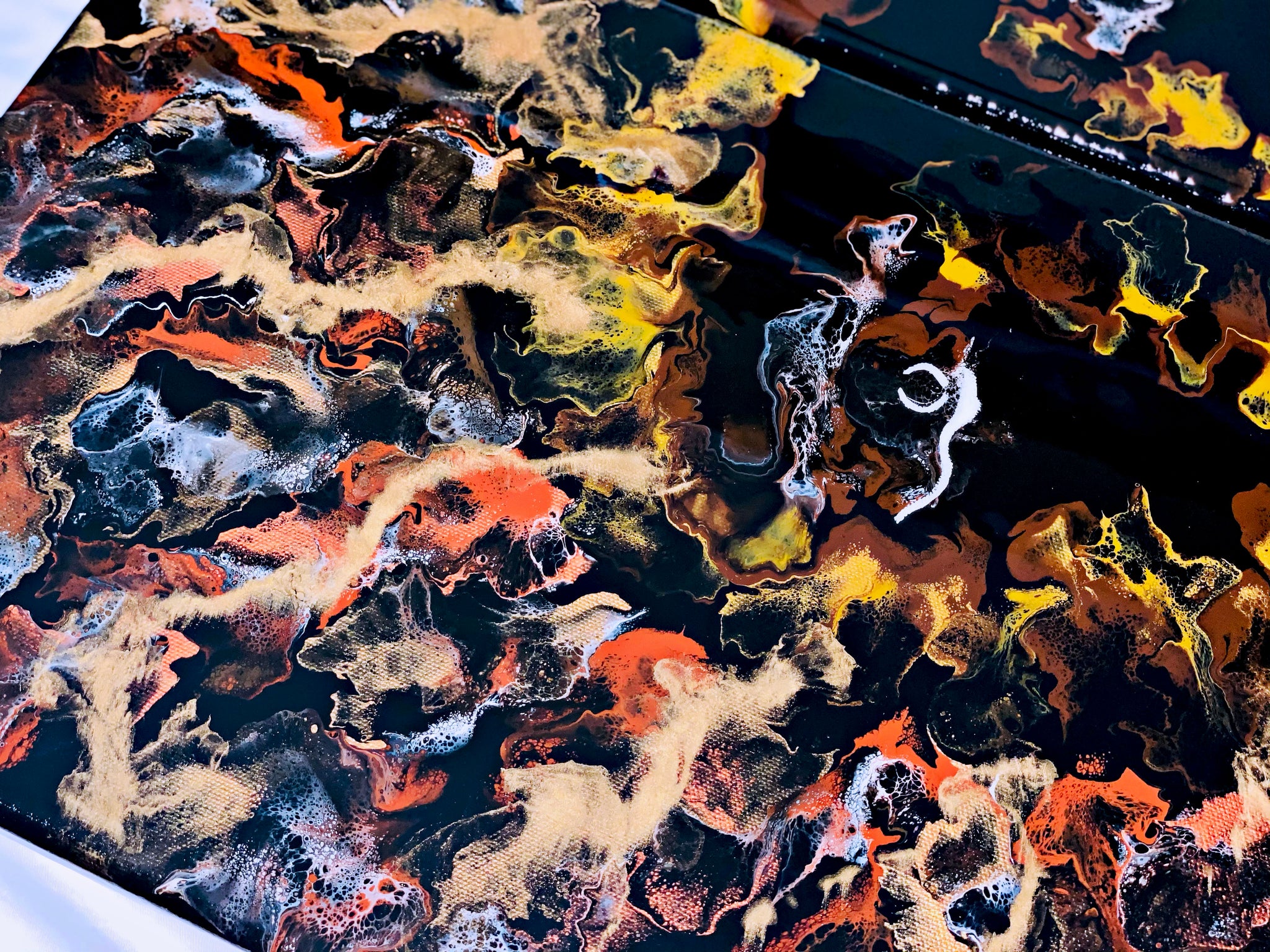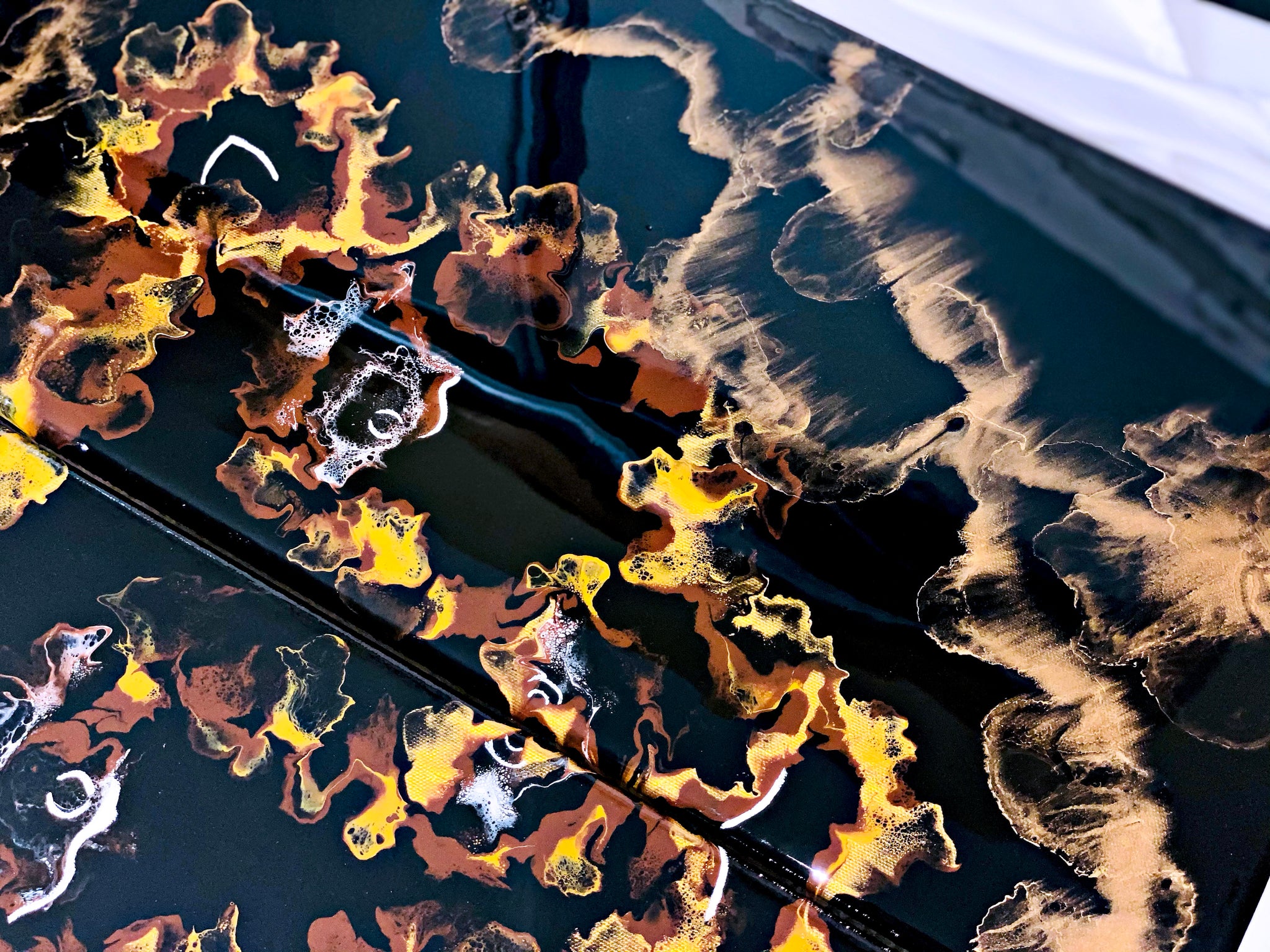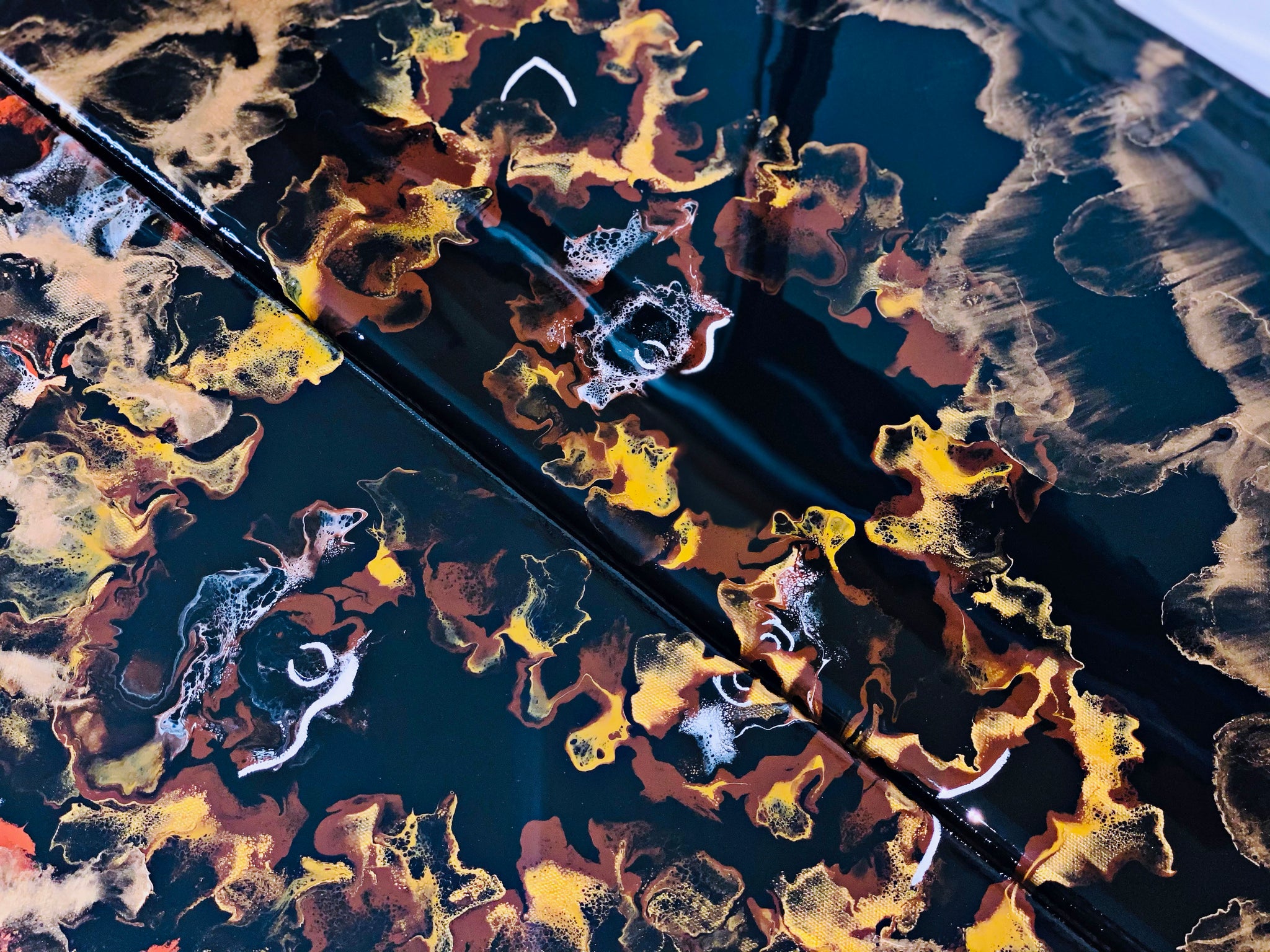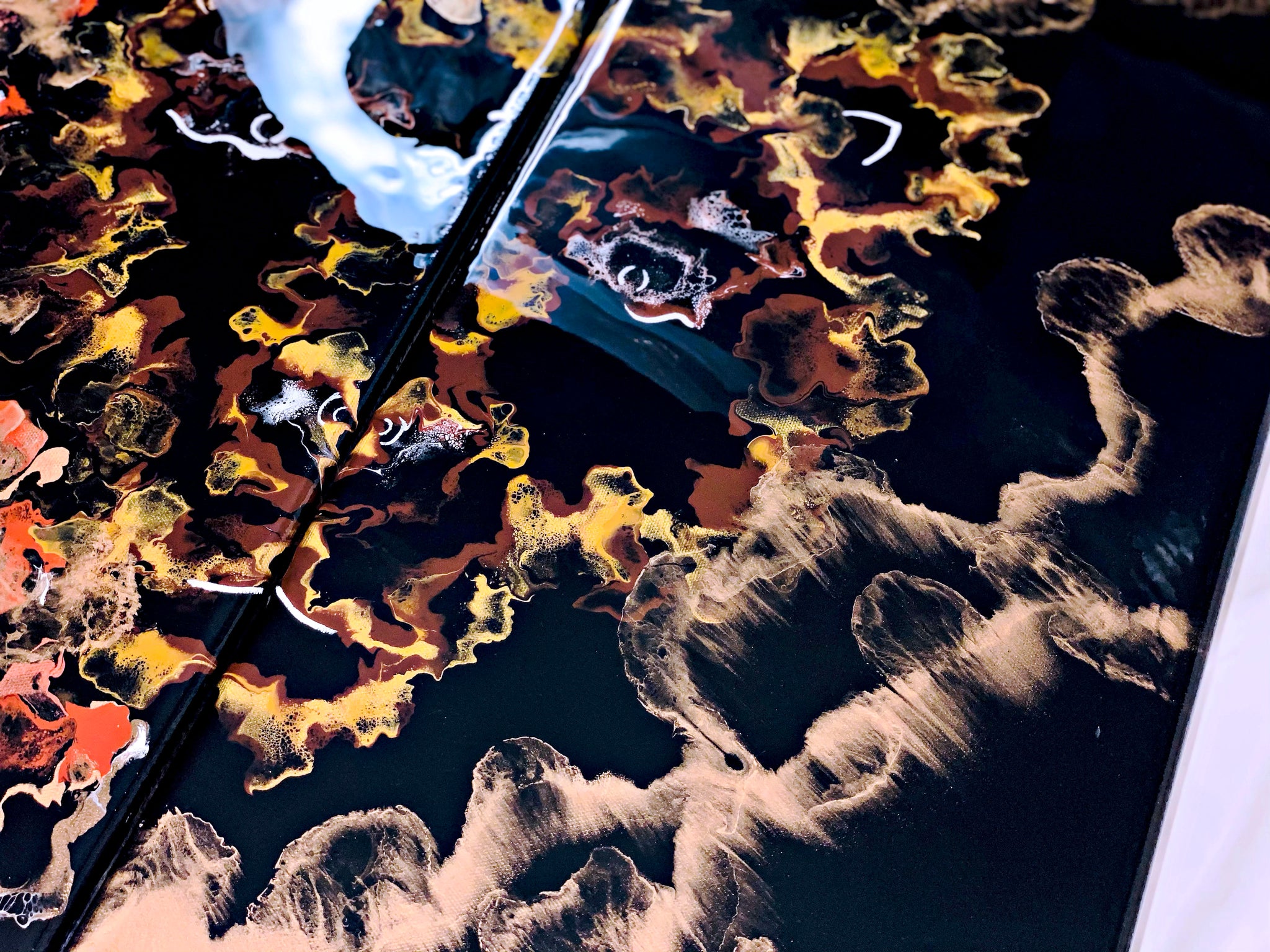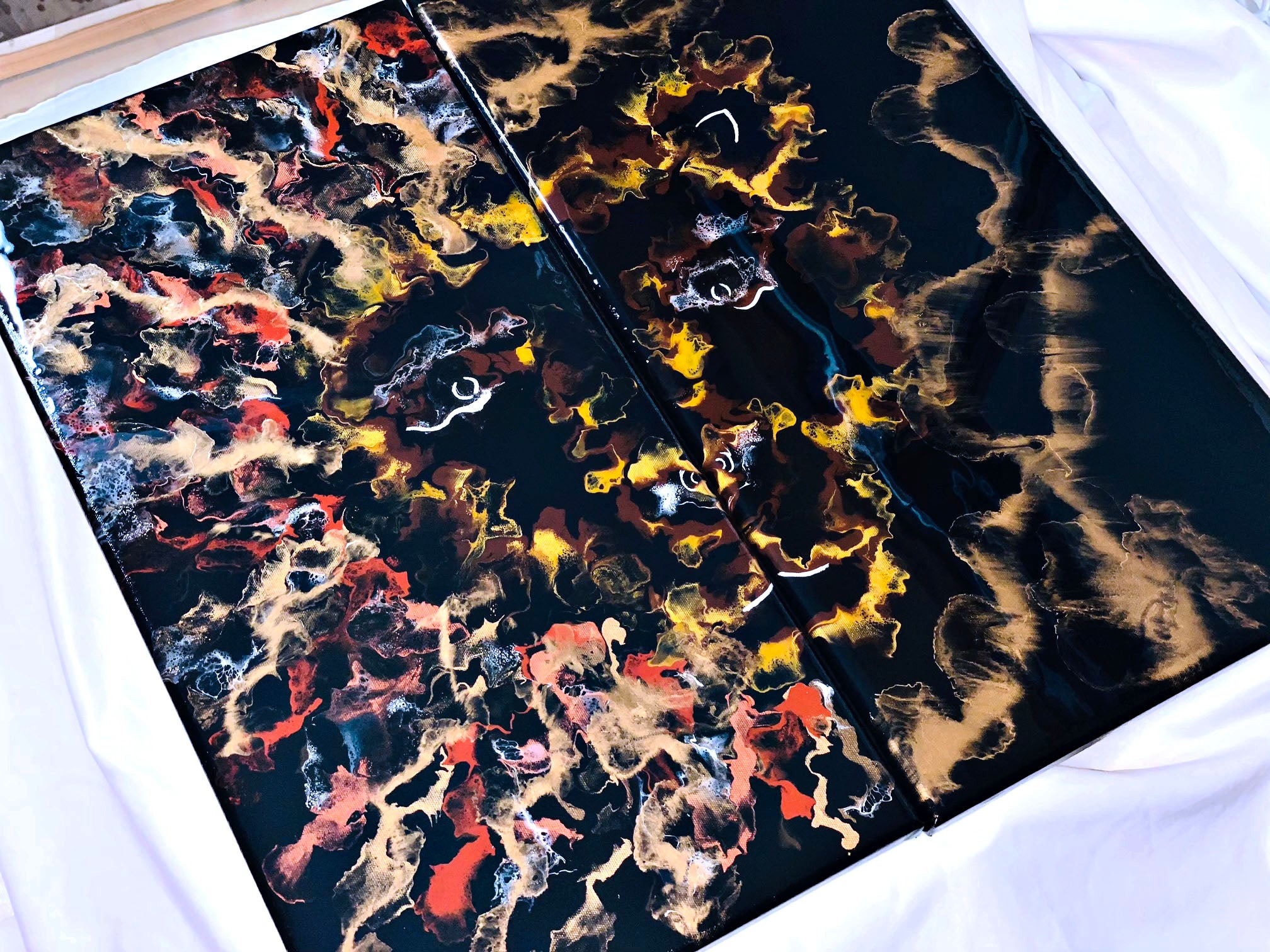 An acrylic pour diptych set of two 12x24 inch canvases. An array of metallic vibrant colors used to create a Lion/Lioness design. This piece is very fun and unique. Coated in resin with gold pigmented details.