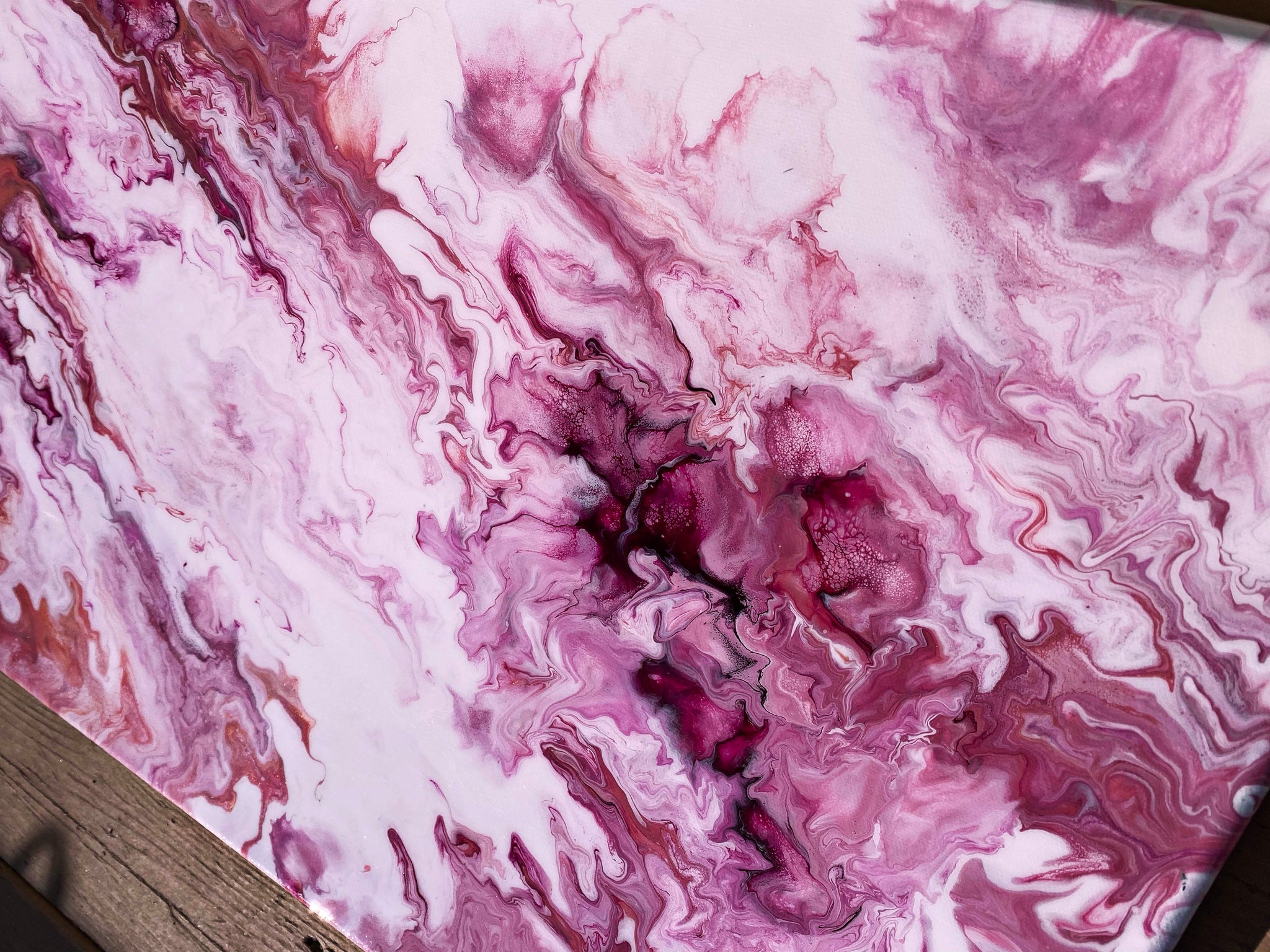 A 15x30 inch acrylic pour canvas. A variety of pinks for the color scheme. Perfect for brighting up a room or matching a “girly” theme. Finished product is coated in resin for a glossy hard finish.