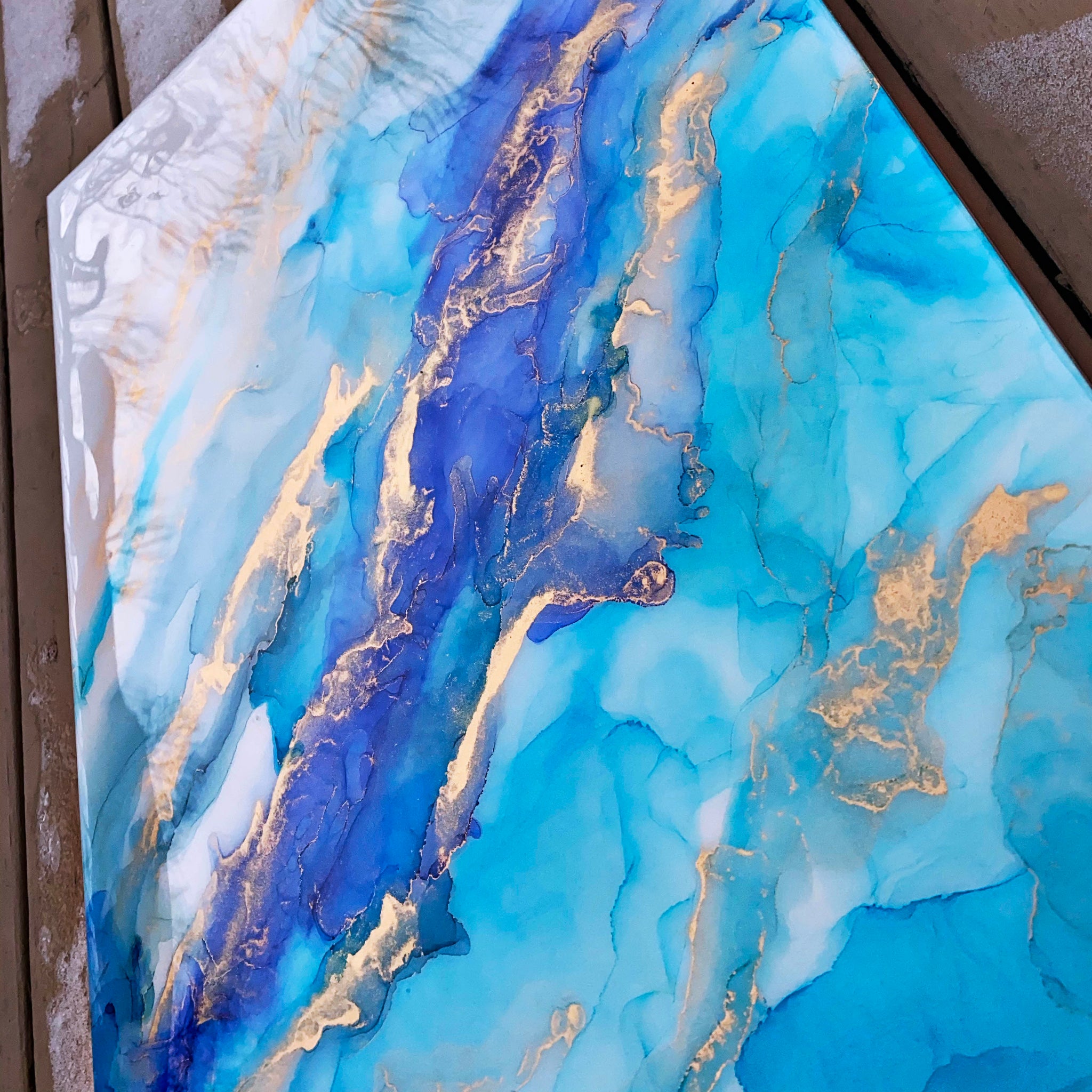 A 18x24 inch alcohol ink painting on a wooden panel. A combination of three different shades of blue and gold metallic inks. A great piece to brighten up a room/space. Piece has been varnished with multiple coats and then finished in resin for a glossy hard touch.