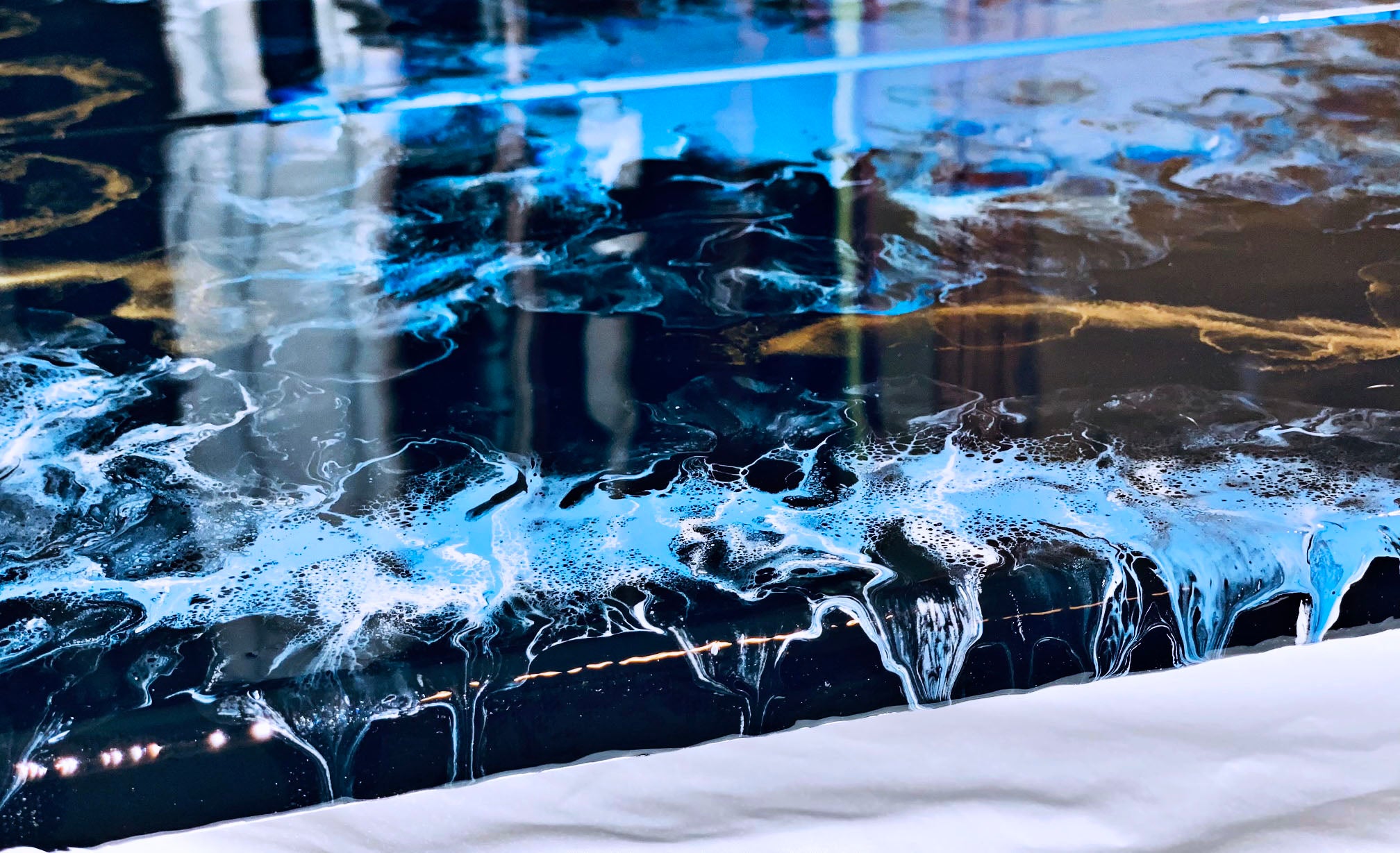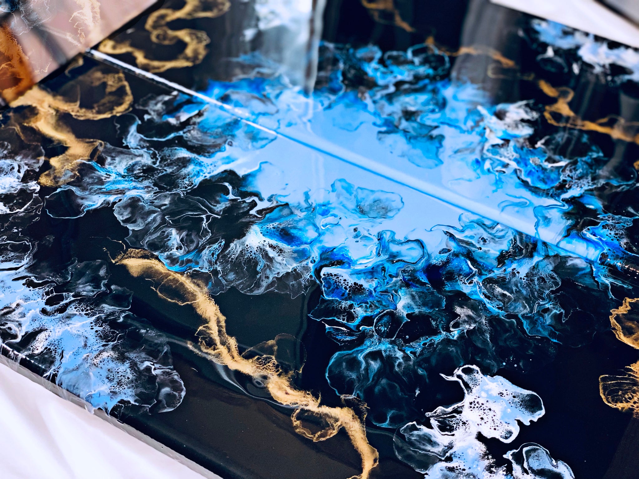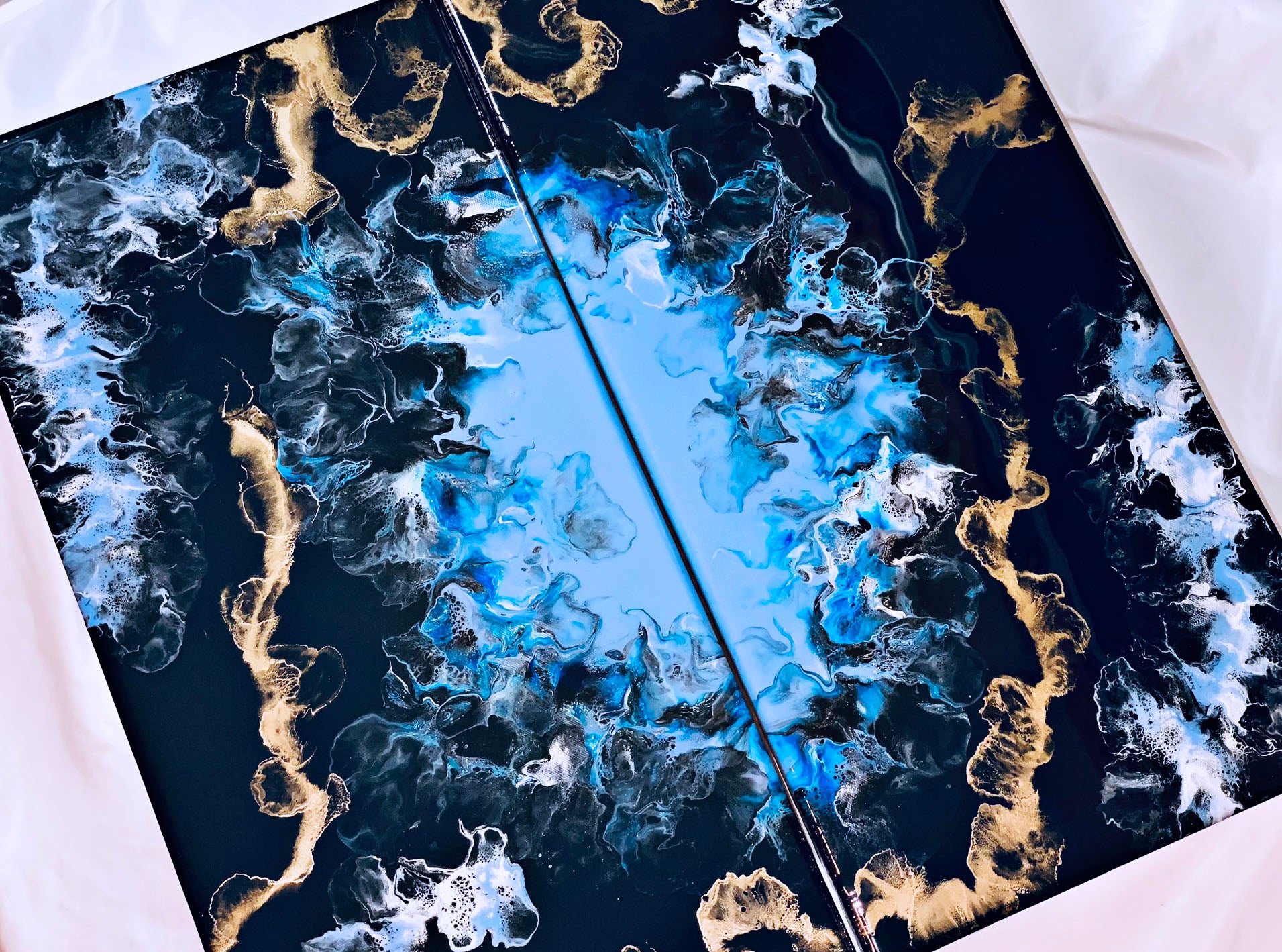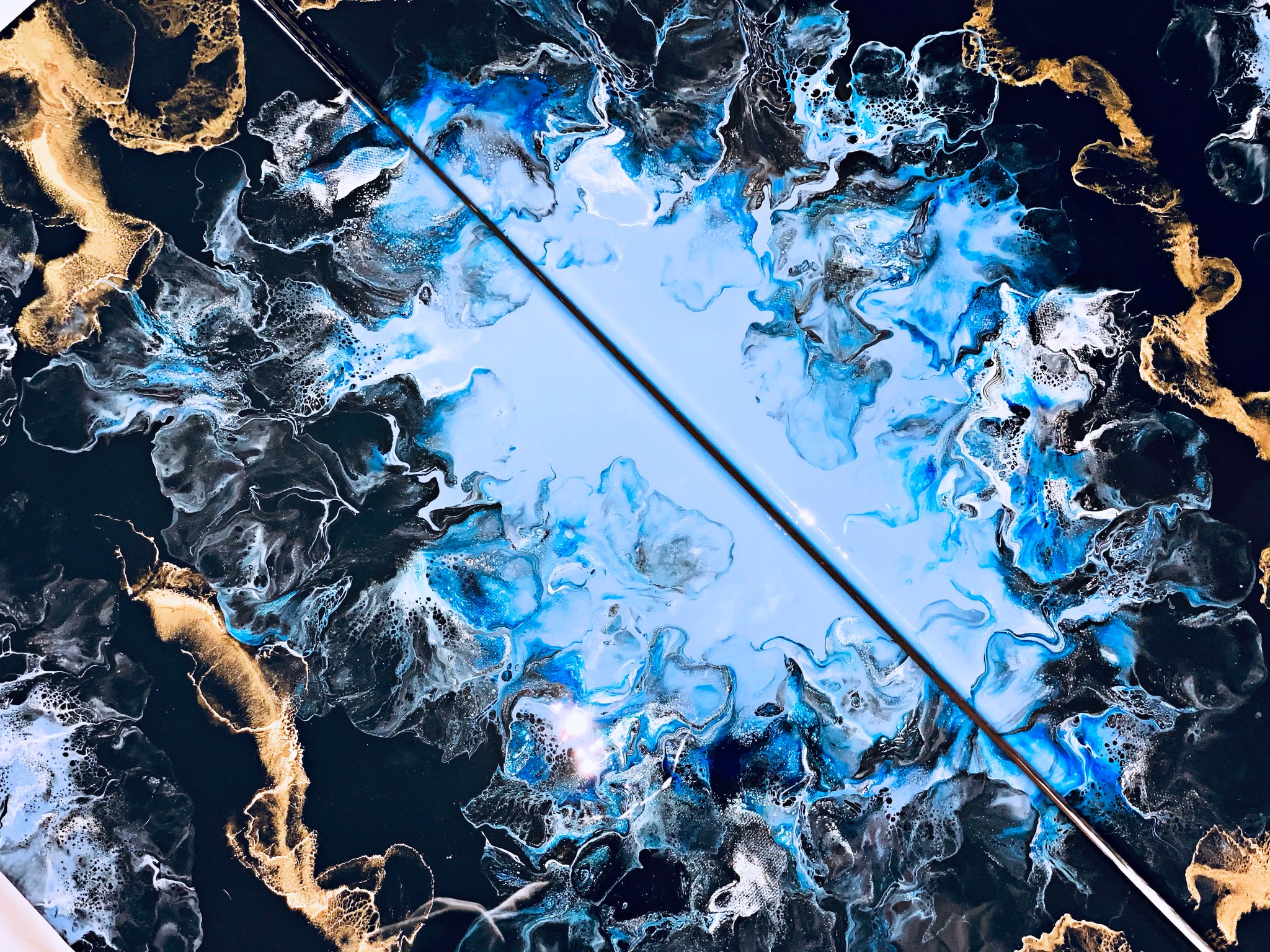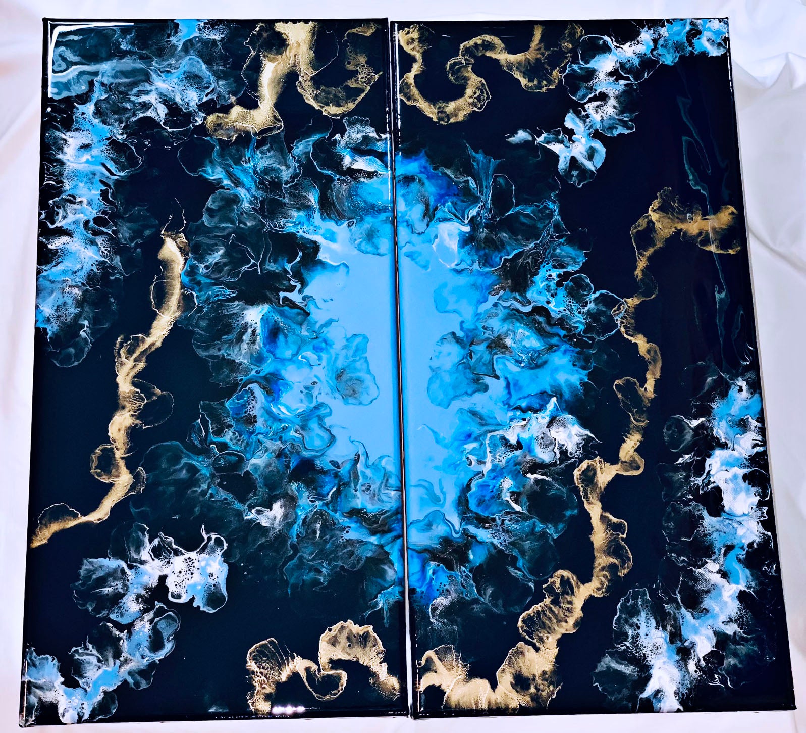 An acrylic pour diptych set of 2 12x24 inch canvases. This piece flows so beautifully with the blue and gold accents. Each canvas has been coated in resin for a hard glossy finish.