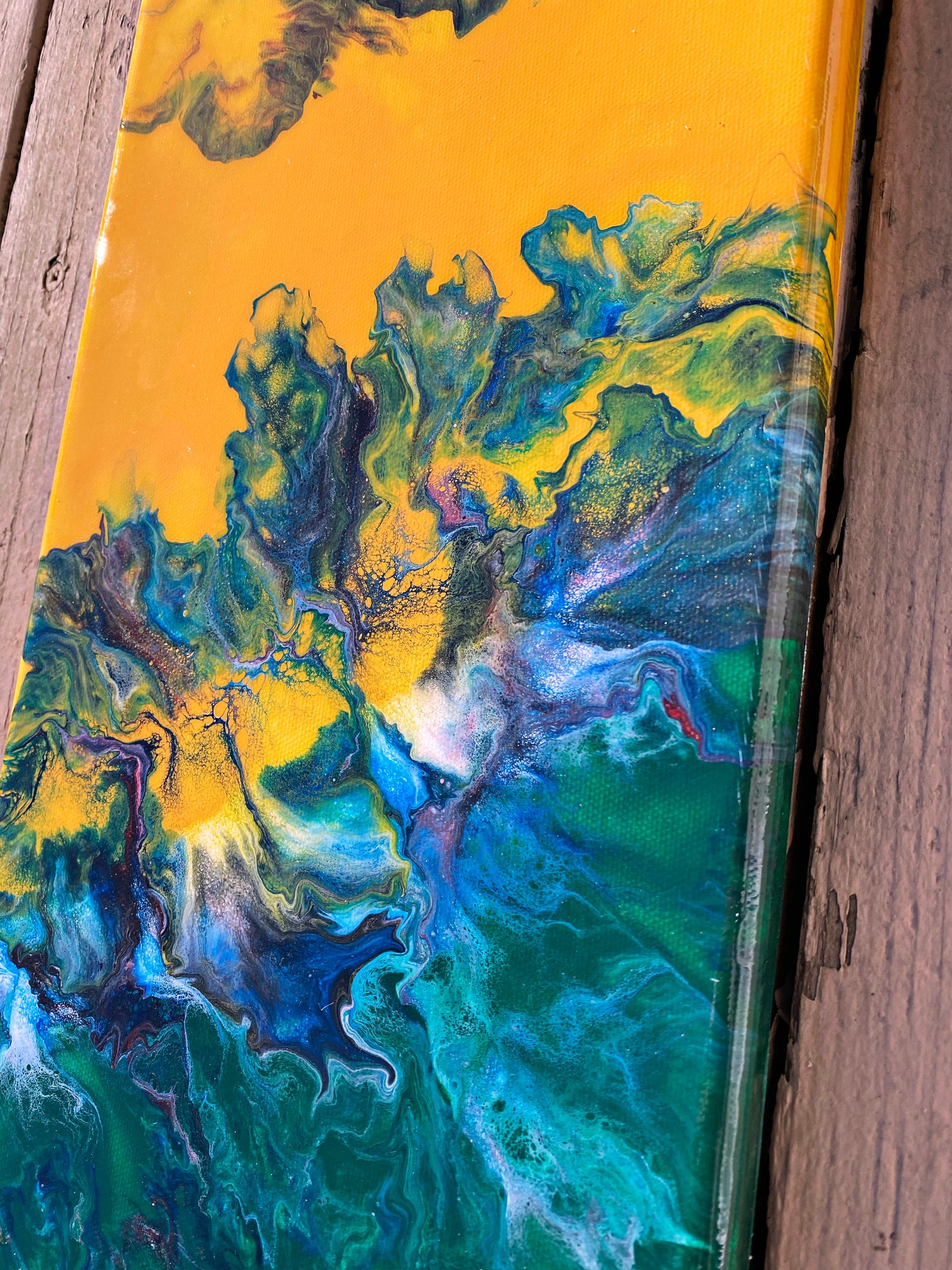 A 8x24 inch acrylic pour canvas. A Jamaican color scheme that will bring more life into any room it is hung up in. Coated in resin for a glossy hard finish.