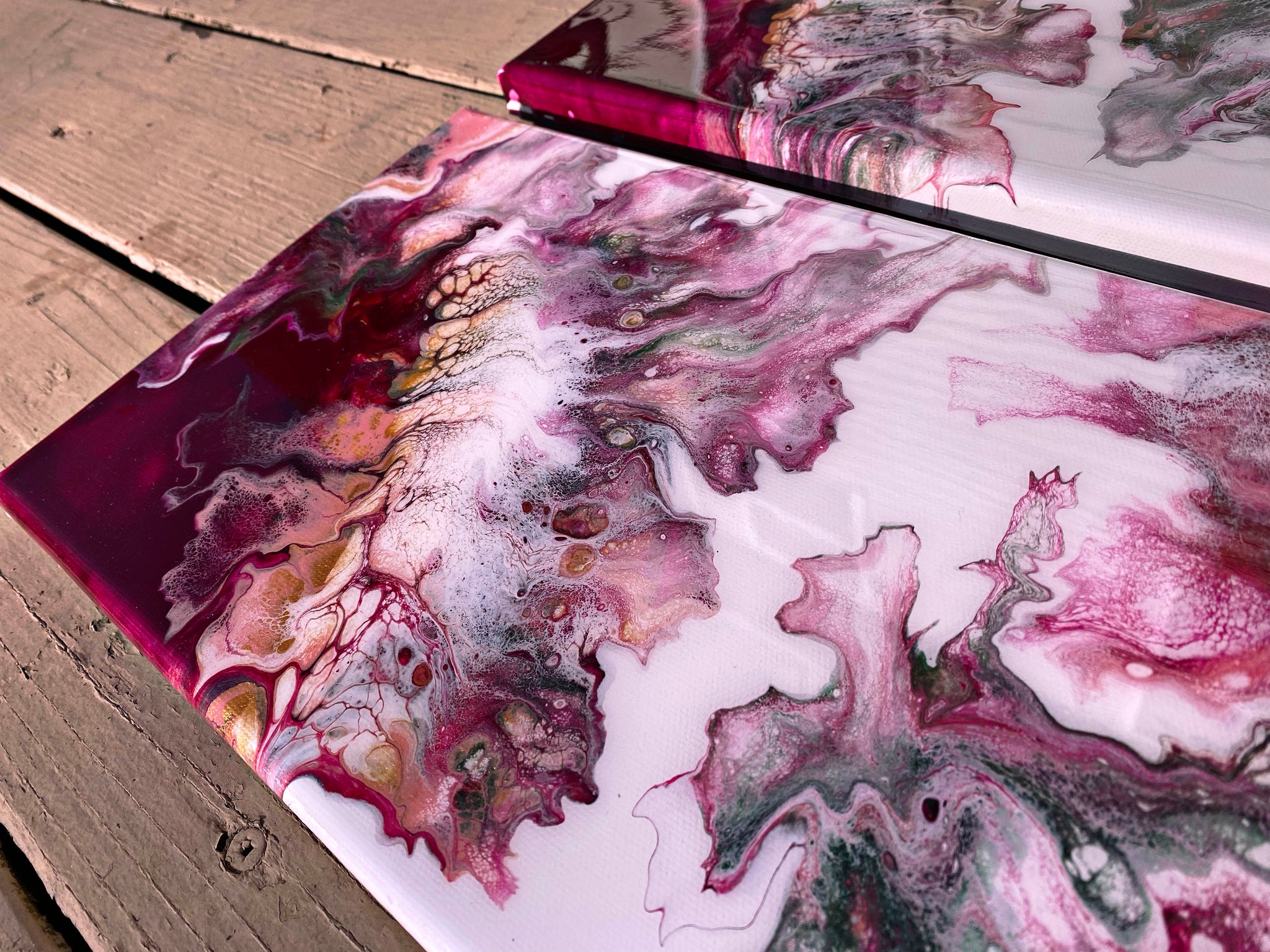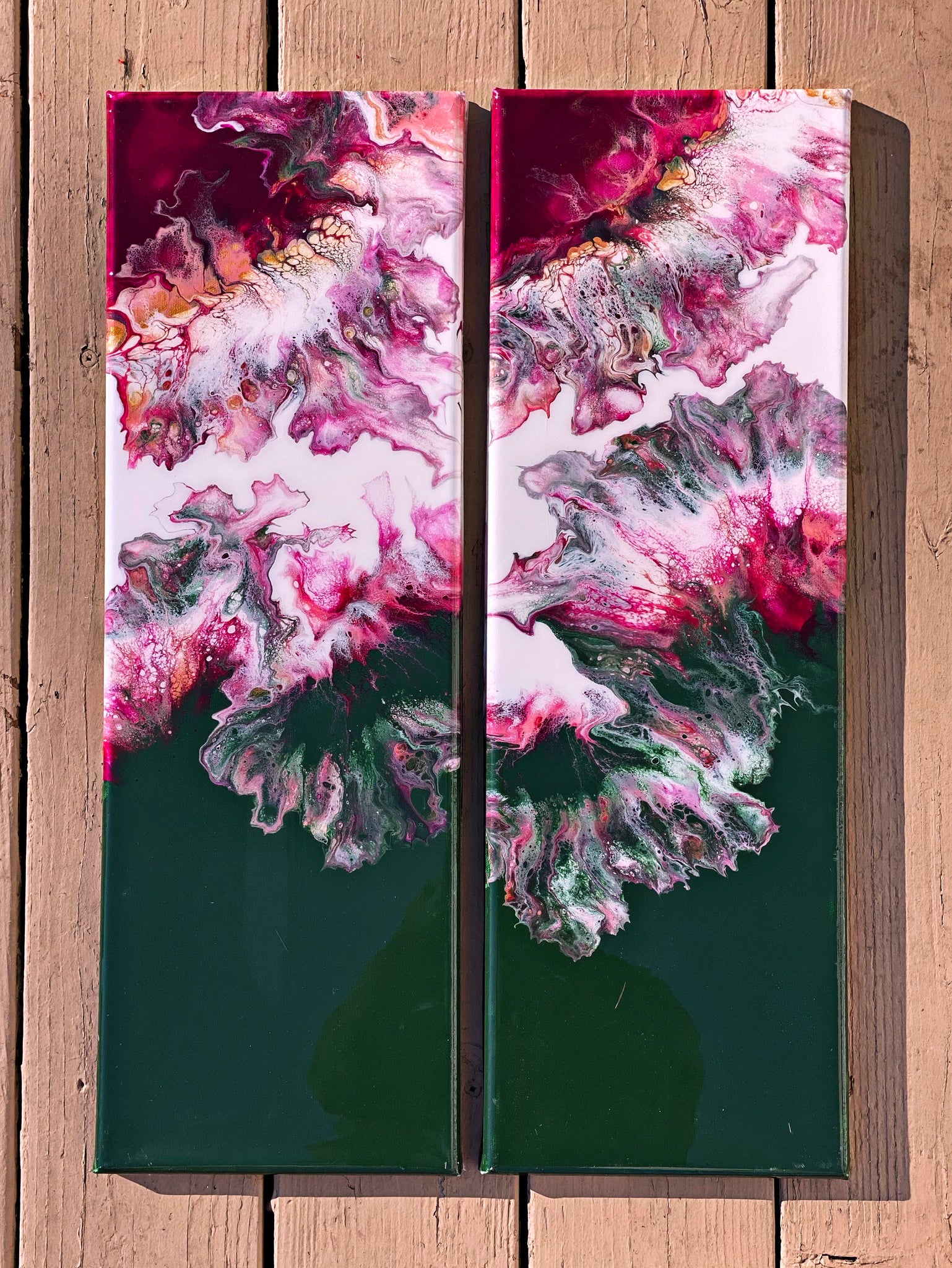 A set of two 8x24 inch acrylic pour canvases with a multicolor split background. These are sold as a pair and are perfect for fitting in narrow areas around the house or office! Coated in resin for a glossy hard finish.