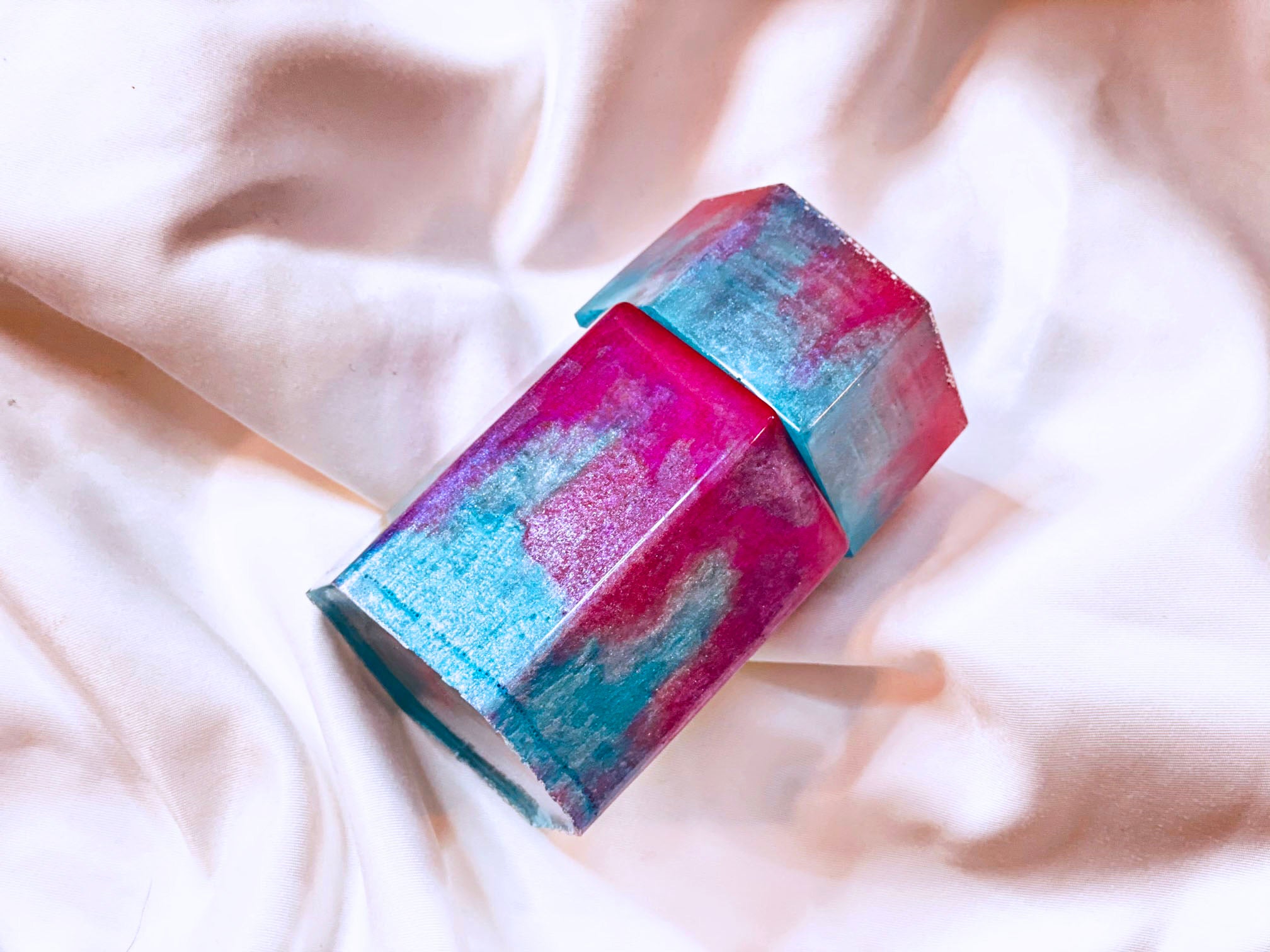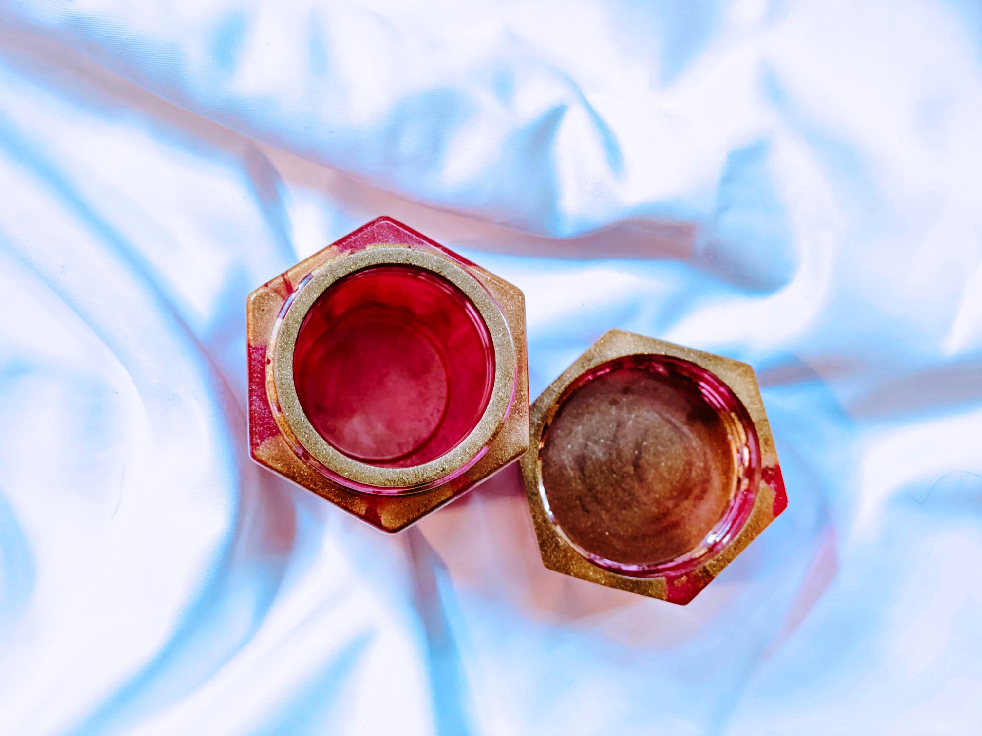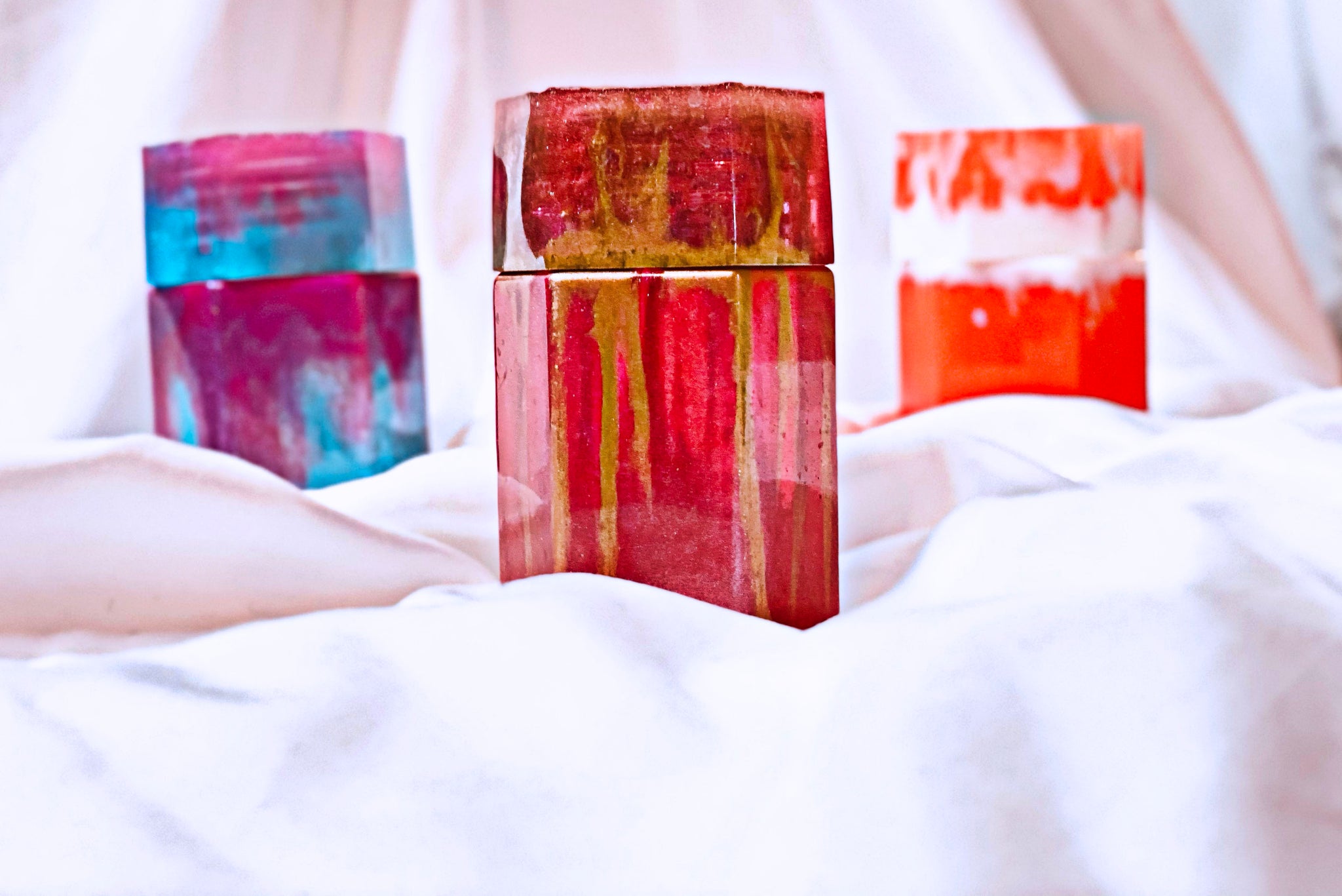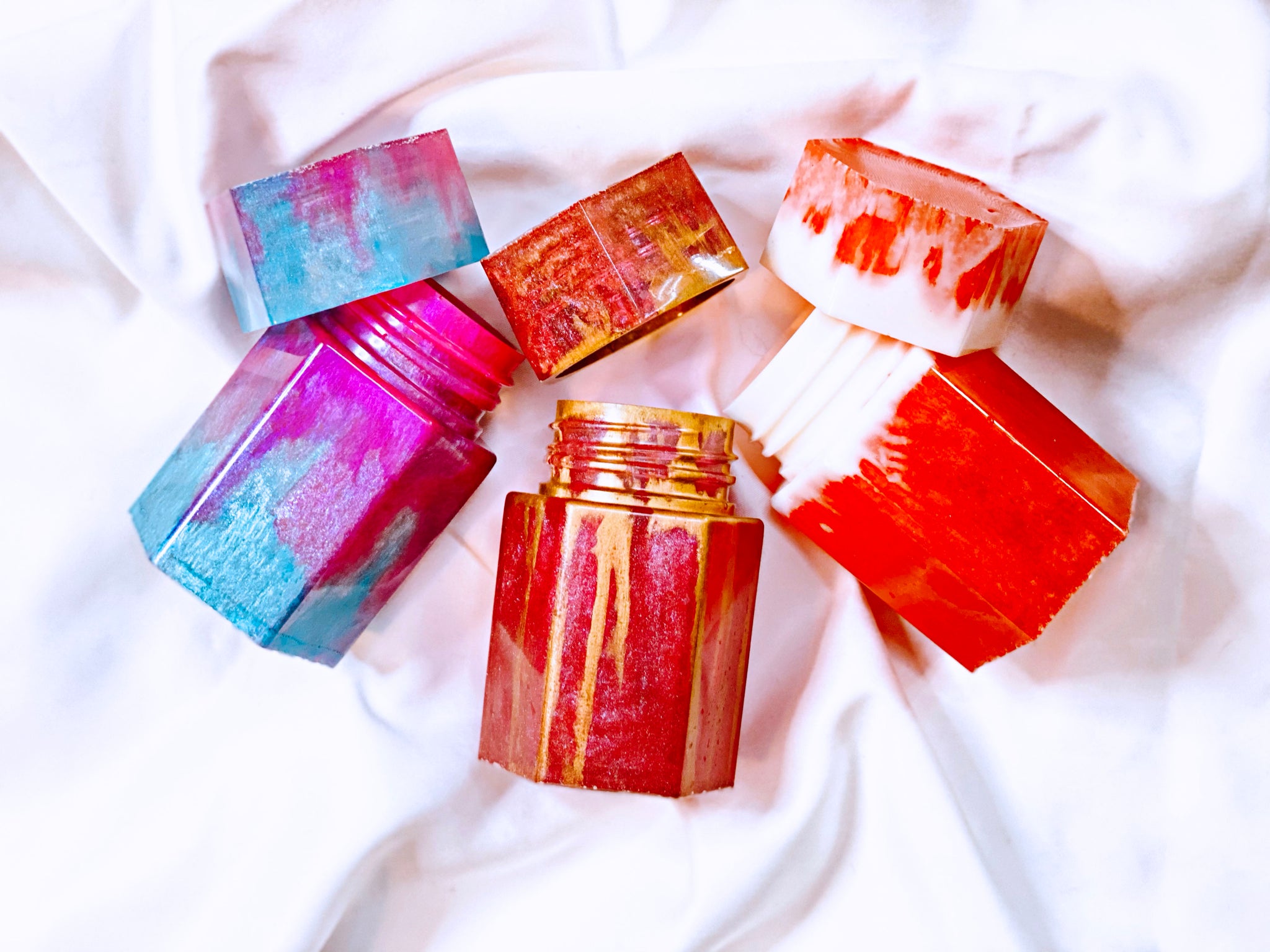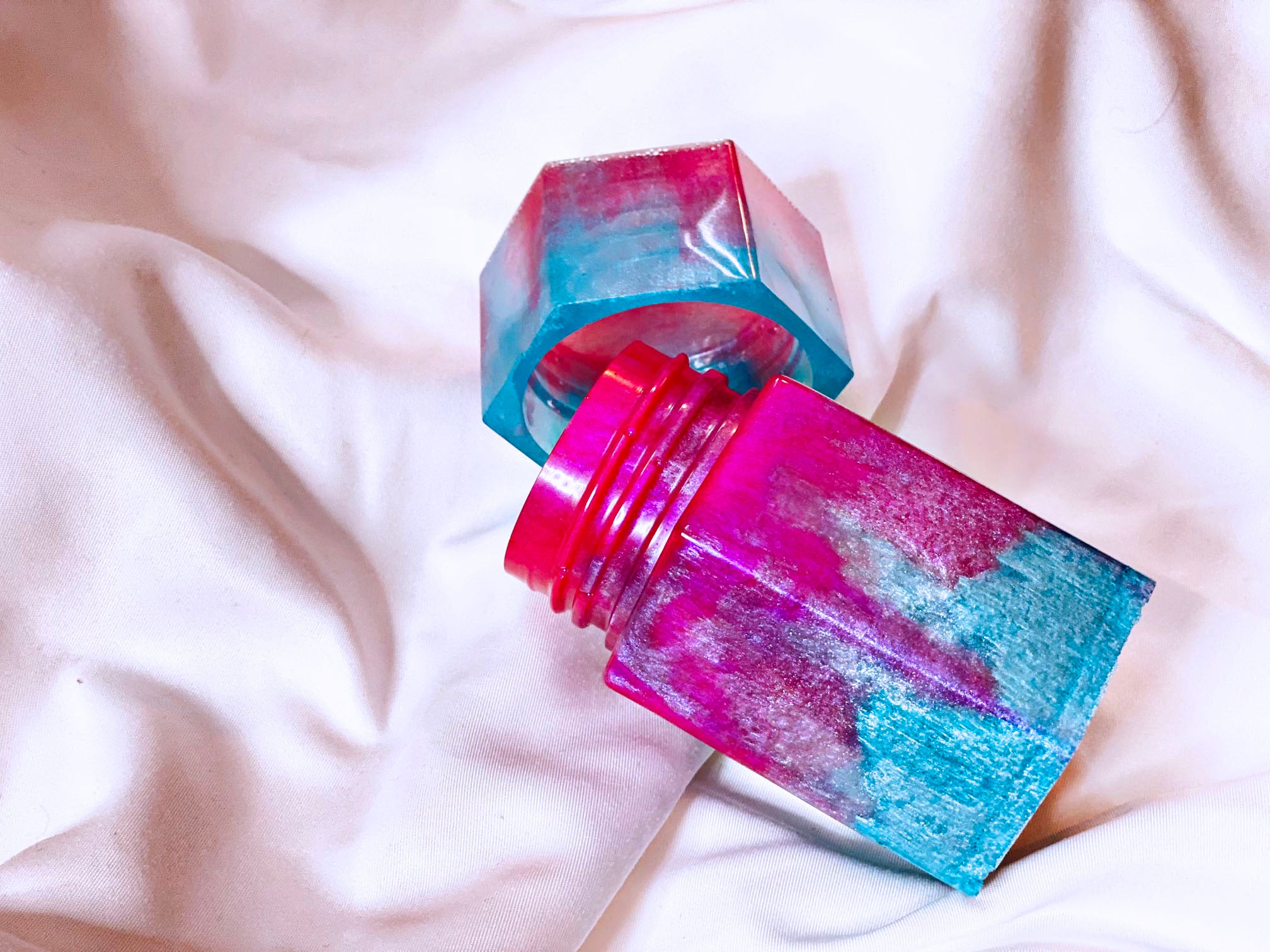 Handmade resin jars. Approximately 2.25x3.5 inches in size. Each jar is made completely out of pigmented resin. Each with their own unique look, colors and design. Sold individually.