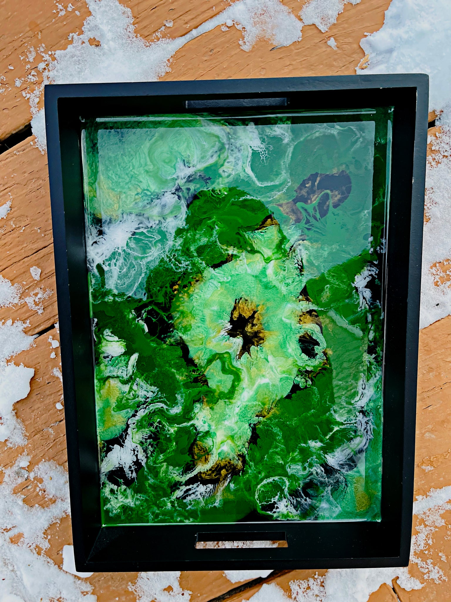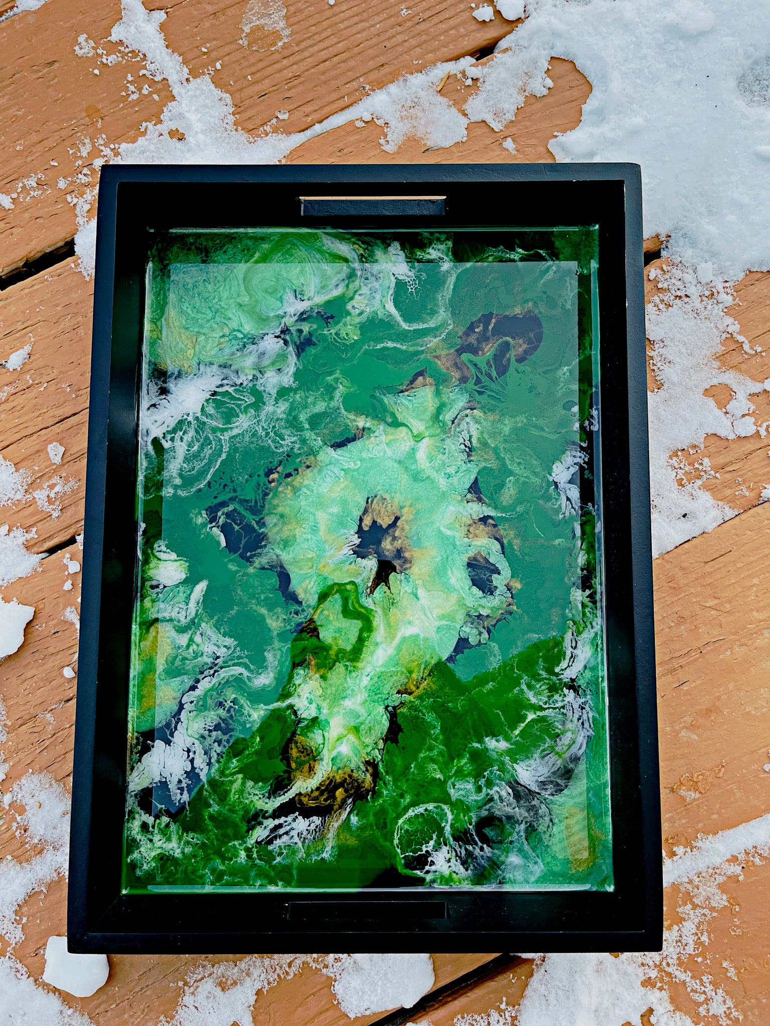 A 10x14 inch resin tray. Created with different sage green pigments & acrylics. A smooth glossy nice finish, making it a perfect addition to any area.