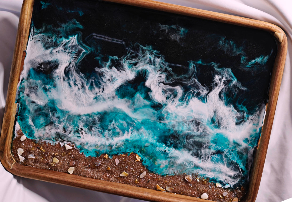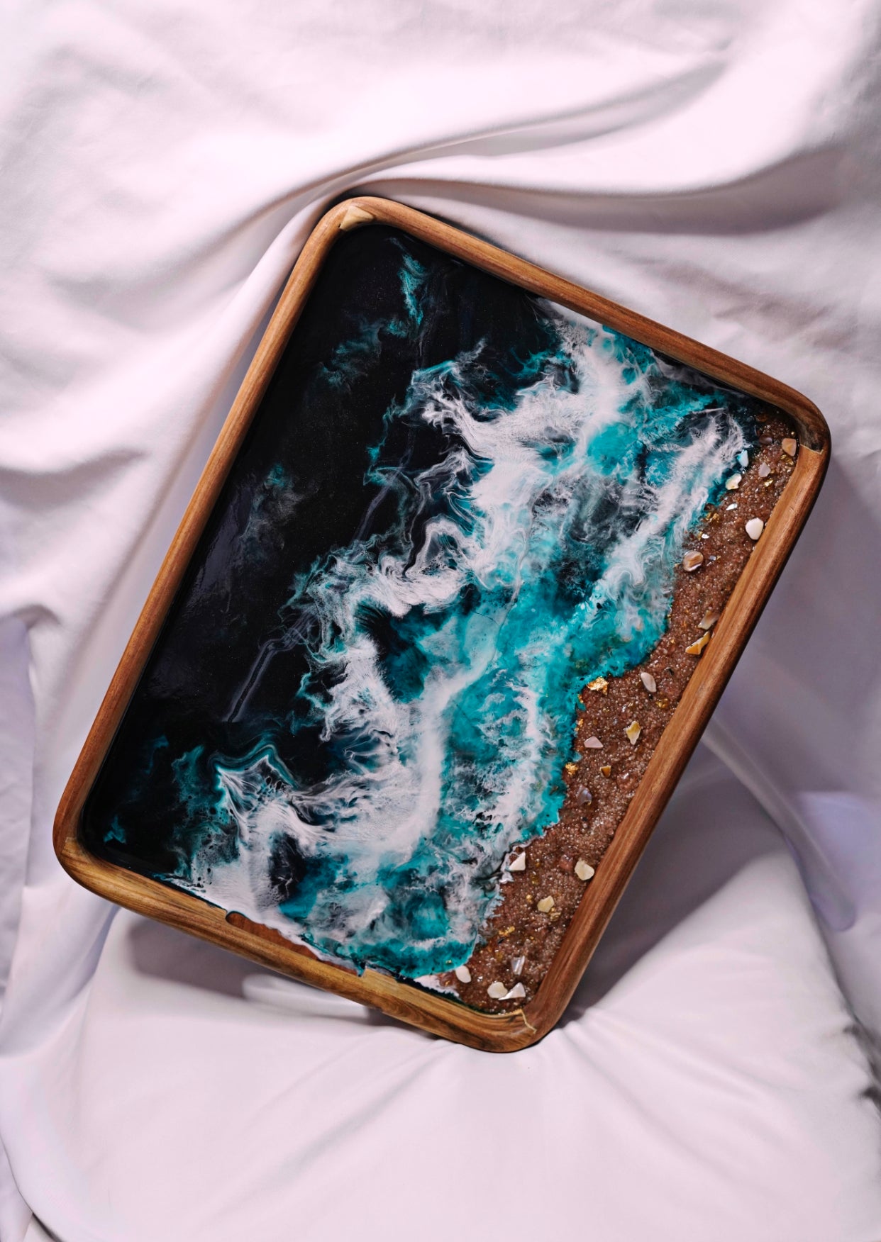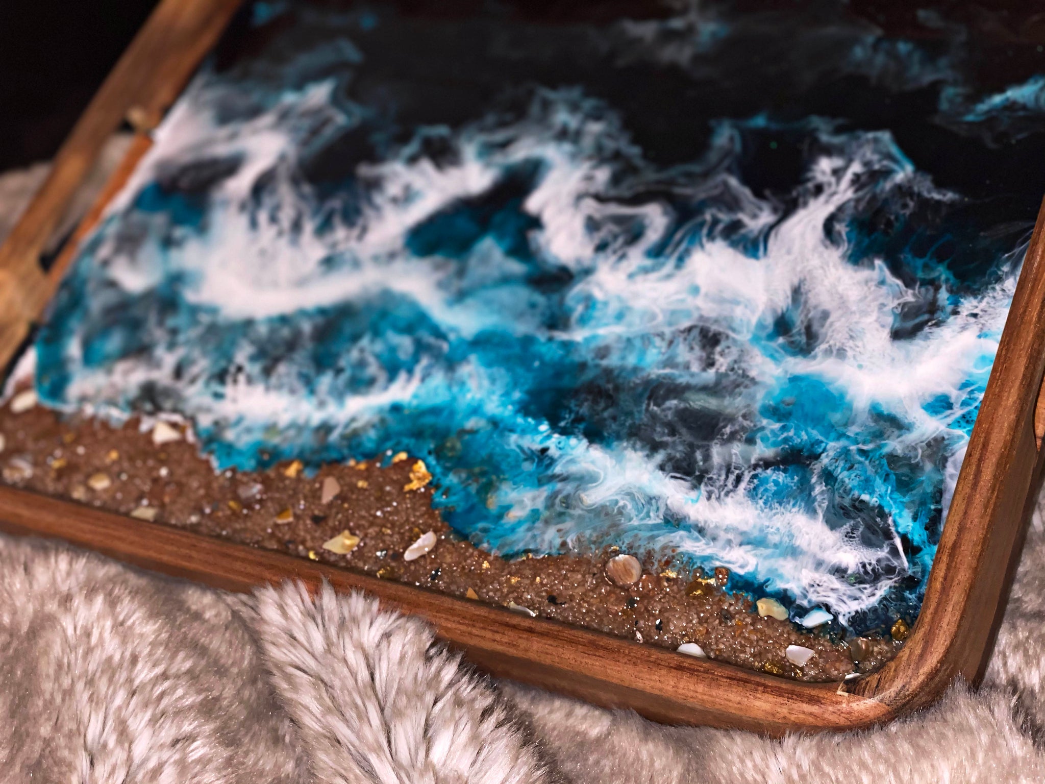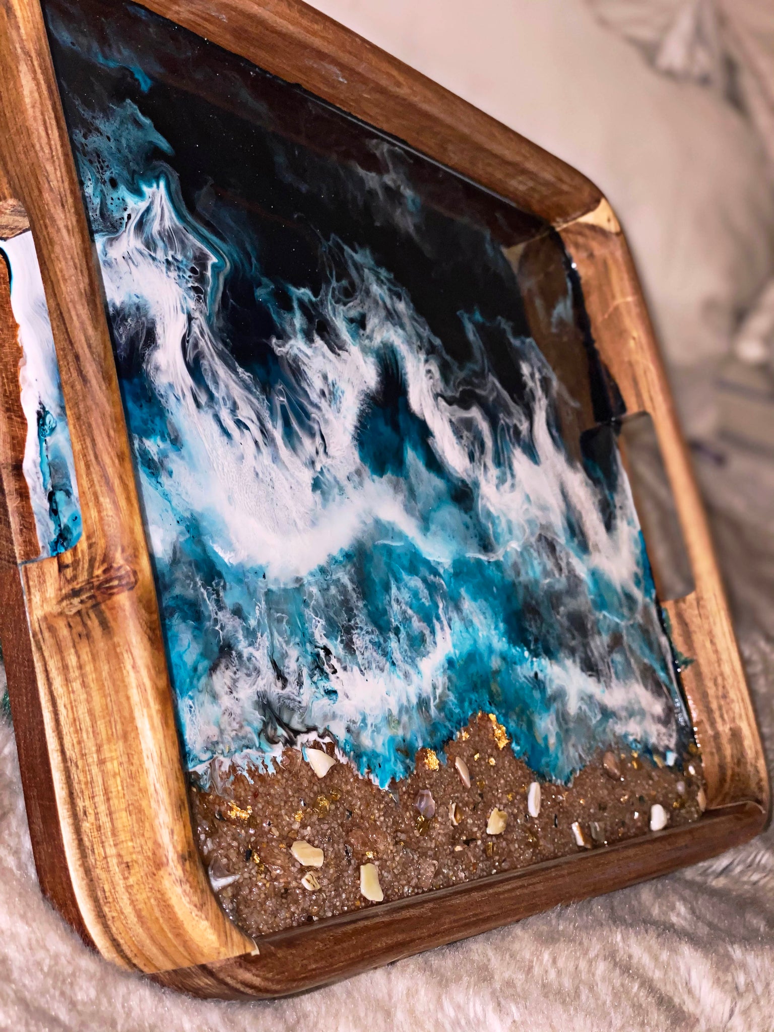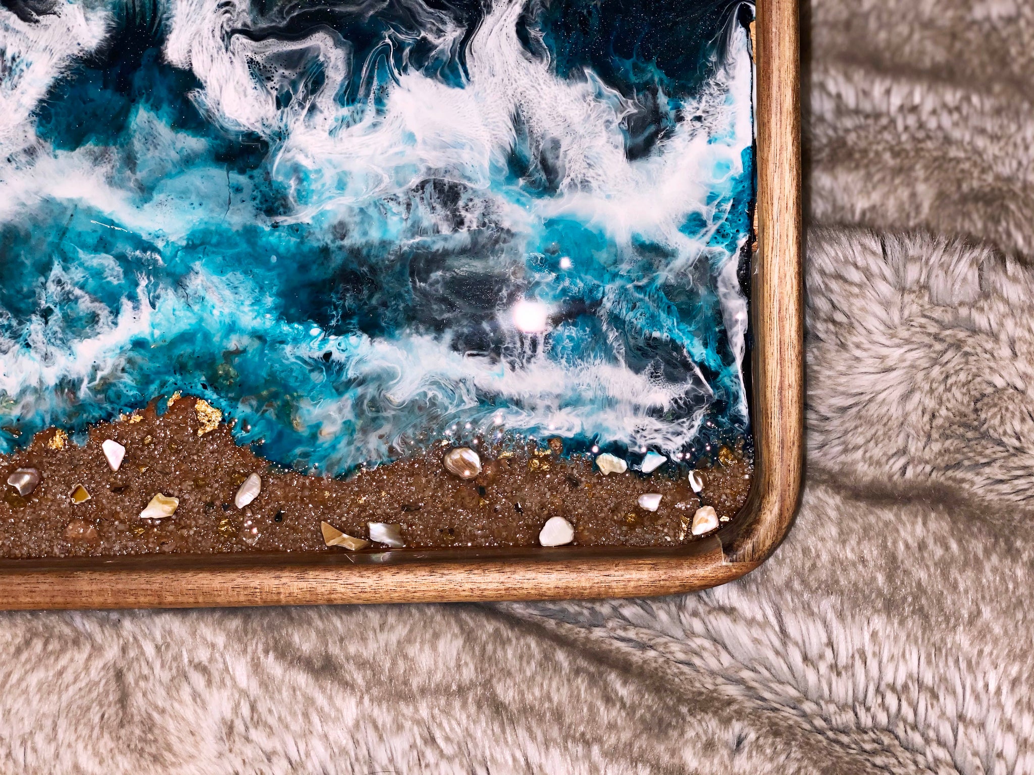 An 12x16 inch wooden tray coated in resin. Each color achieved through different inks and pigments mixed into resin. The sandy beach front decorated with sand, shells, different colored shattered glass and gold leaf. Textured from each individual layer that has been added to the tray. All resin is food safe. Perfect for serving horderves or just holding small items.
