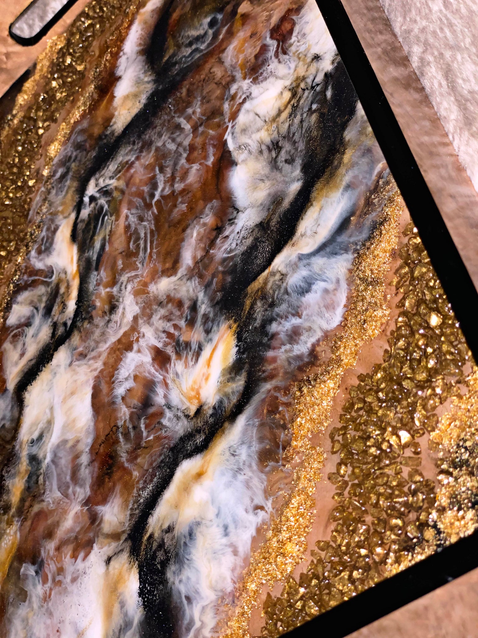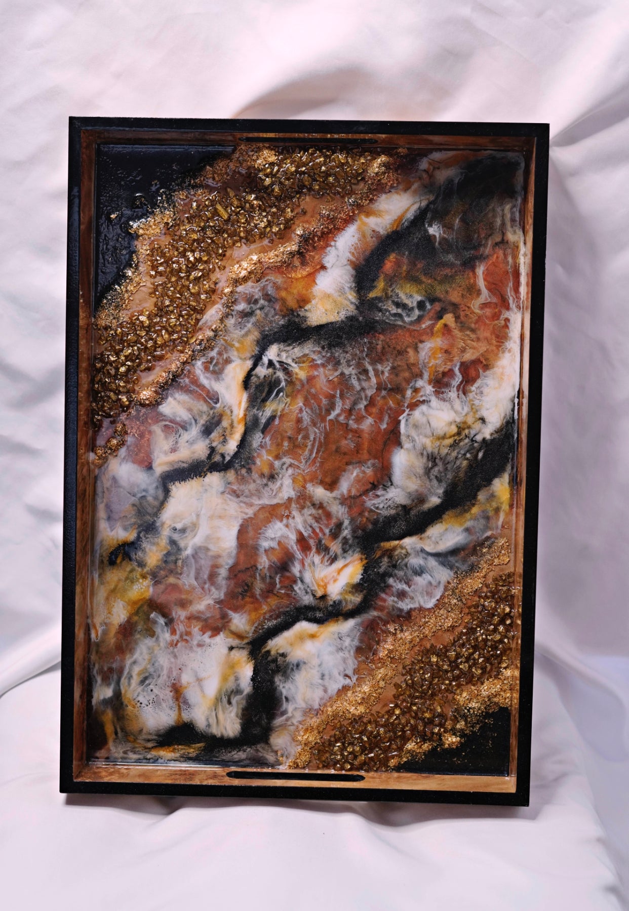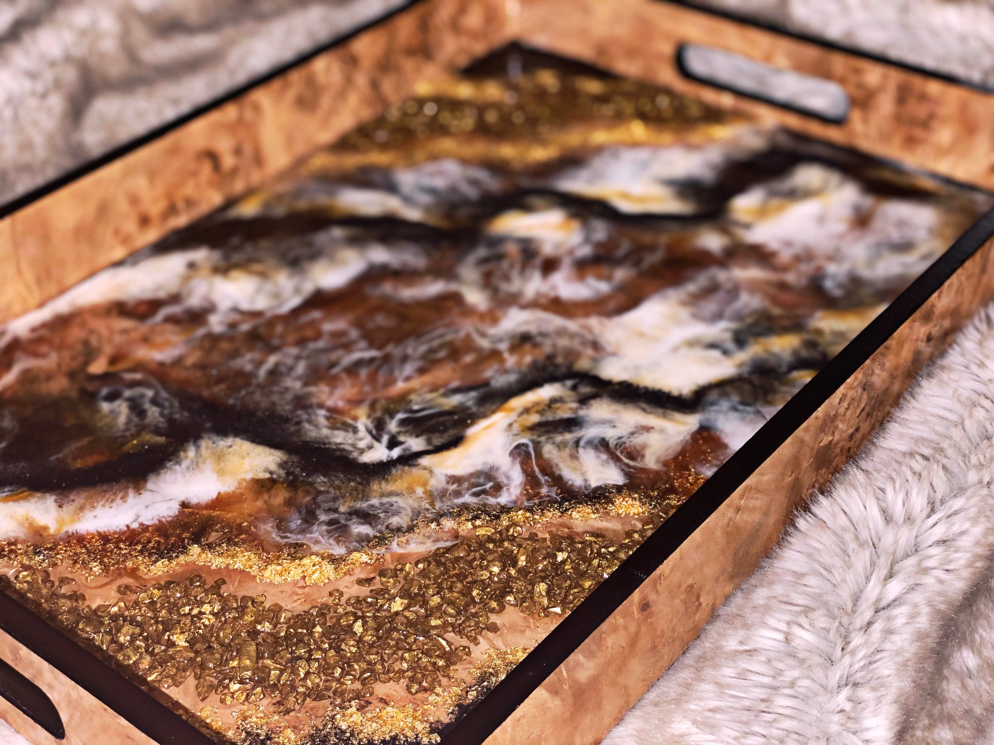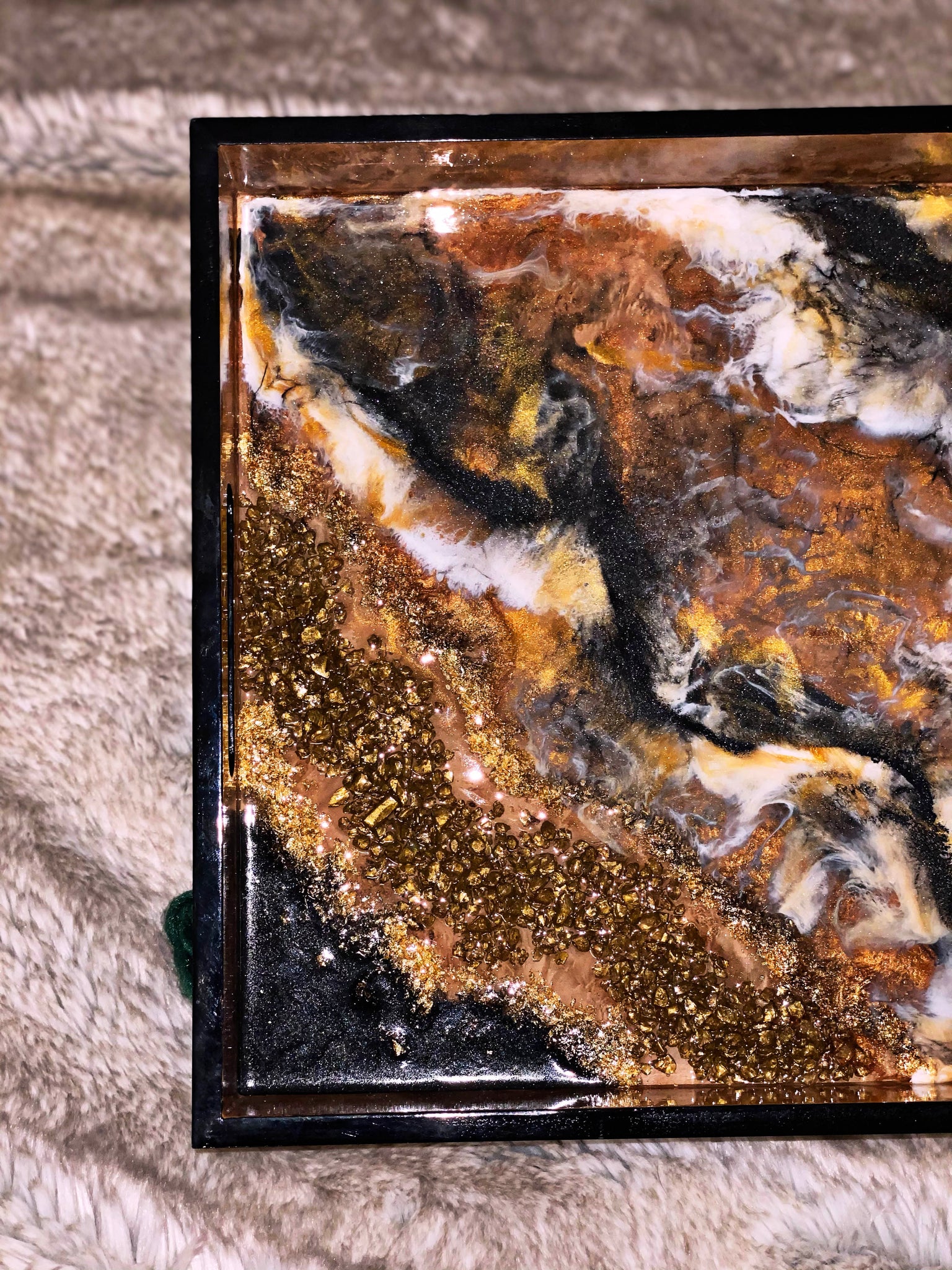 A 12x17 inch decorative tray coated in pigmented resin. Gold stones and gold leaf added into the design, also creating texture and depth. Multiple layers all done in food safe resin.
