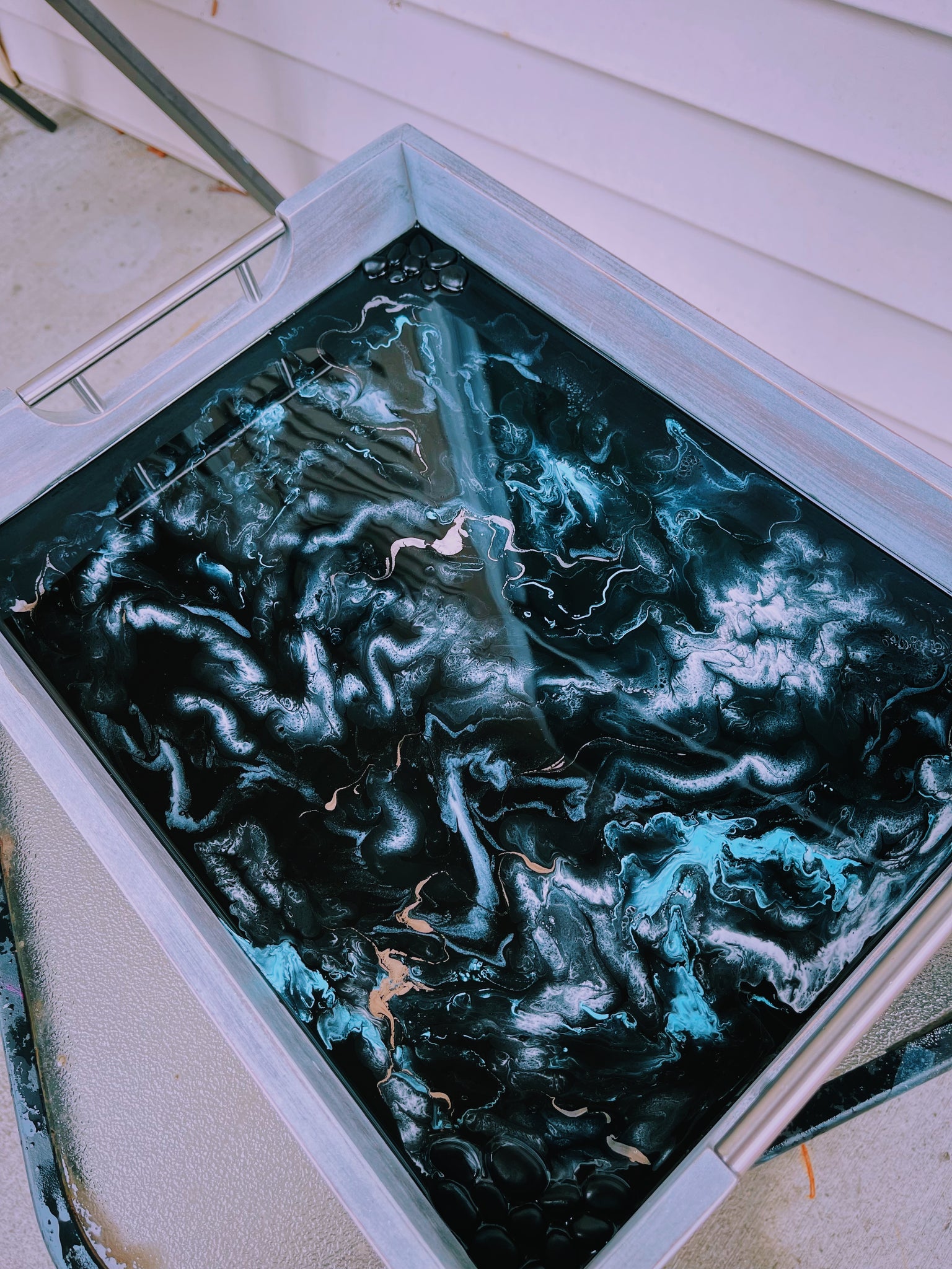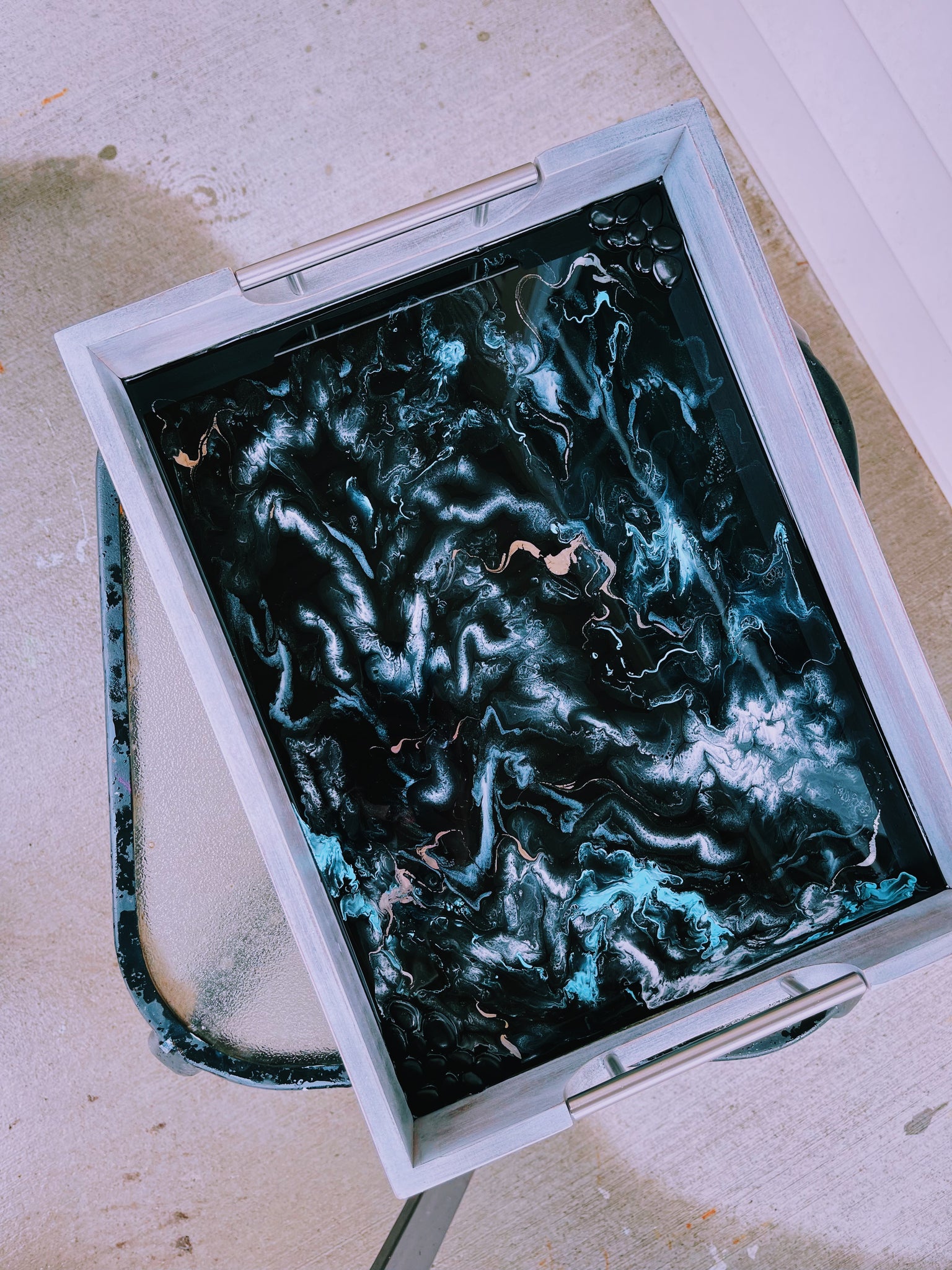 An approx. 12.5 x 16.5 inch wooden tray coated in pigmented resin with fluid abstract designs and black stone detailing.