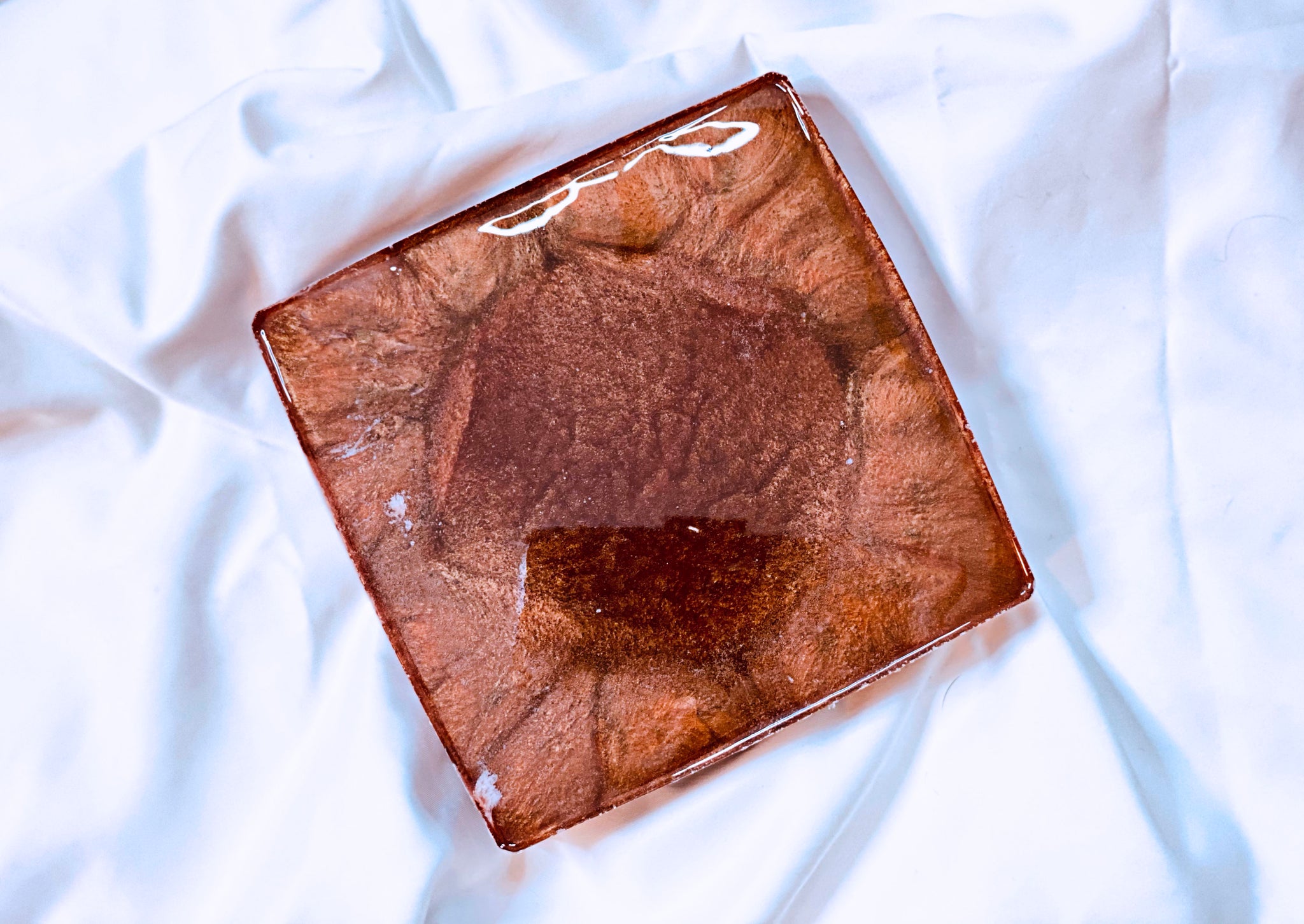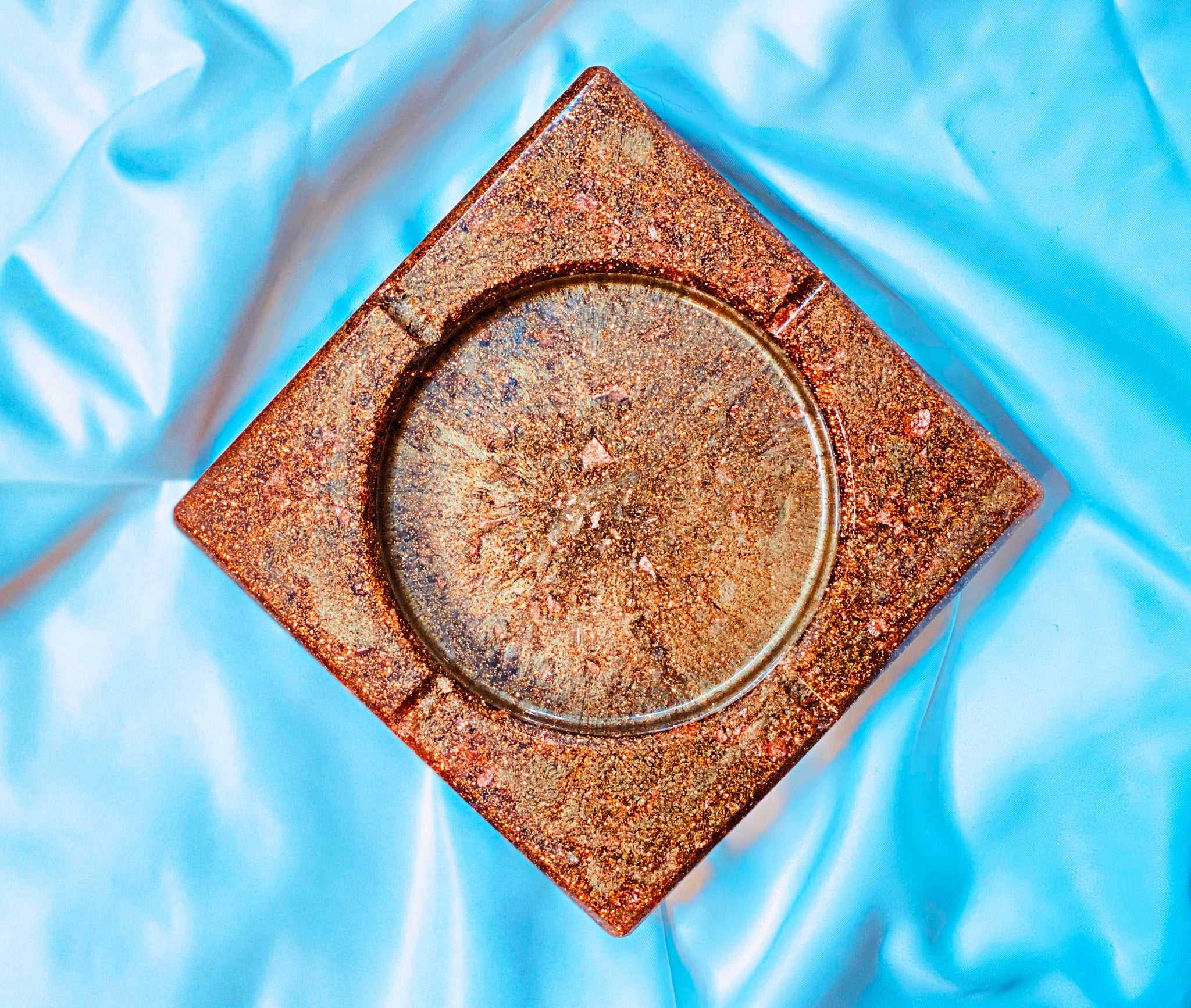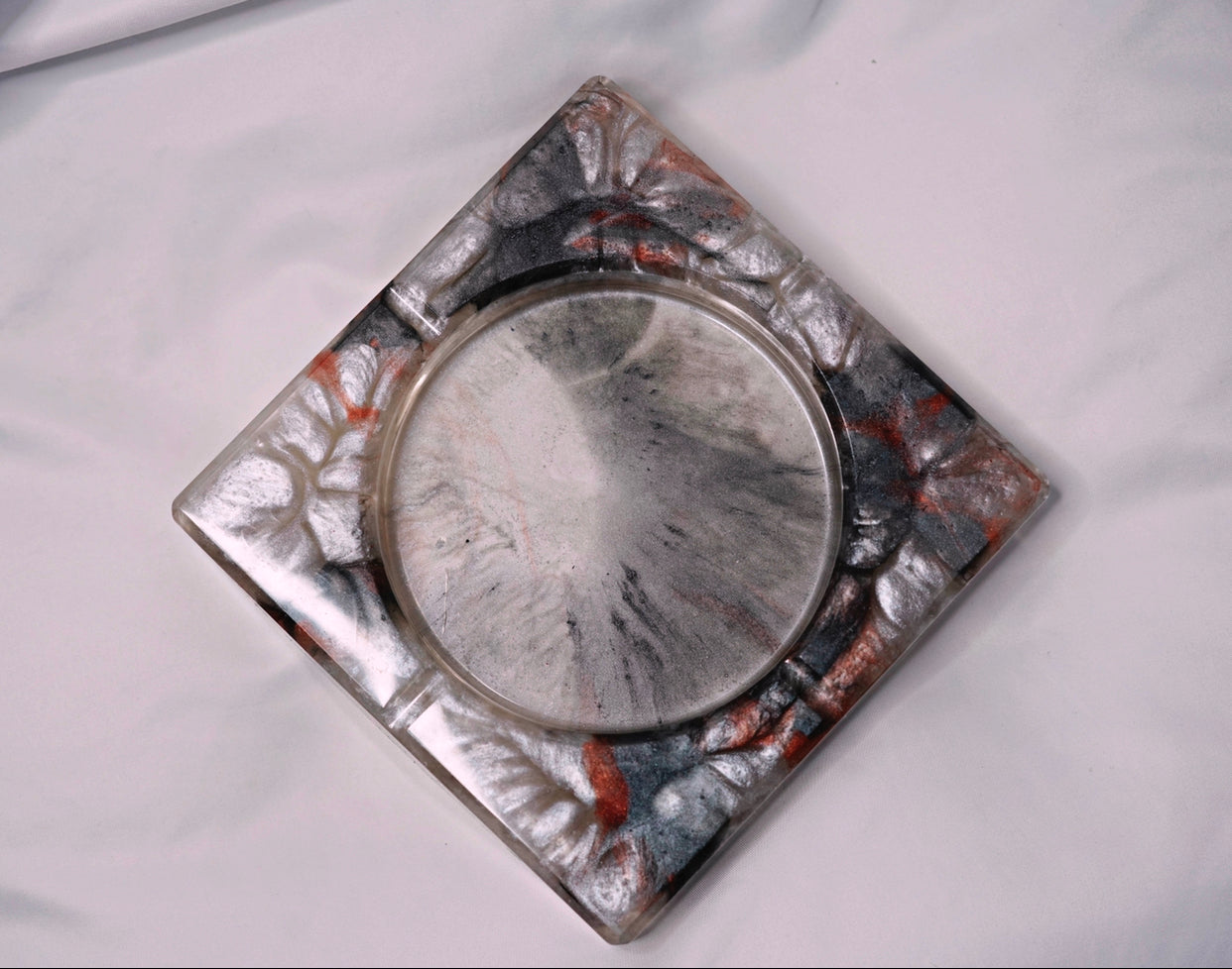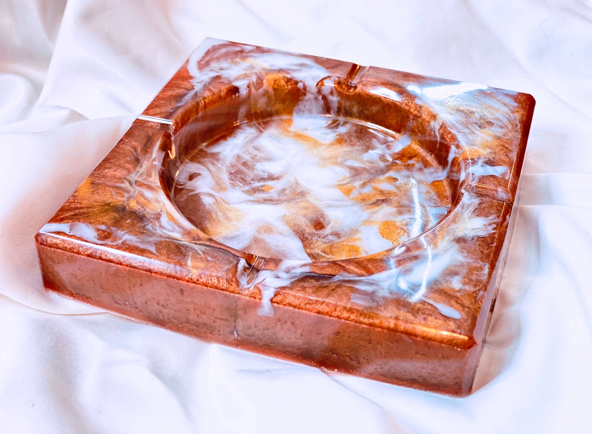 Handmade resin ash trays. Approximately 6x6 inches in size. Each ash tray is made completely out of pigmented resin. Each with their own unique look and design. Sold individually.