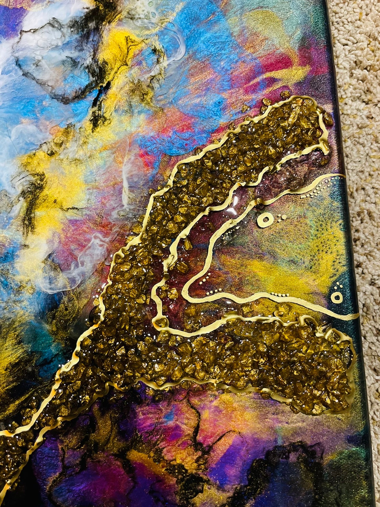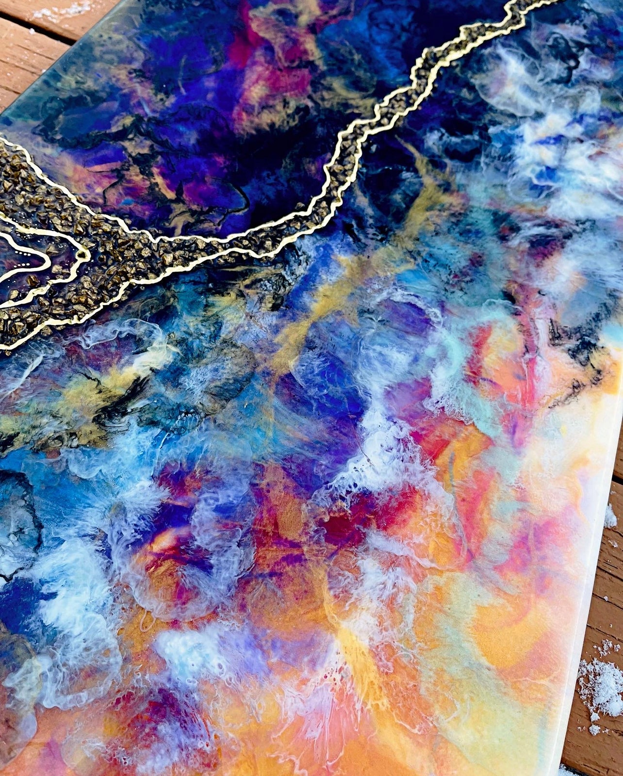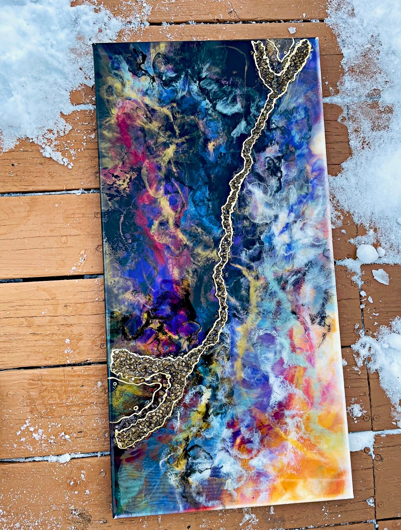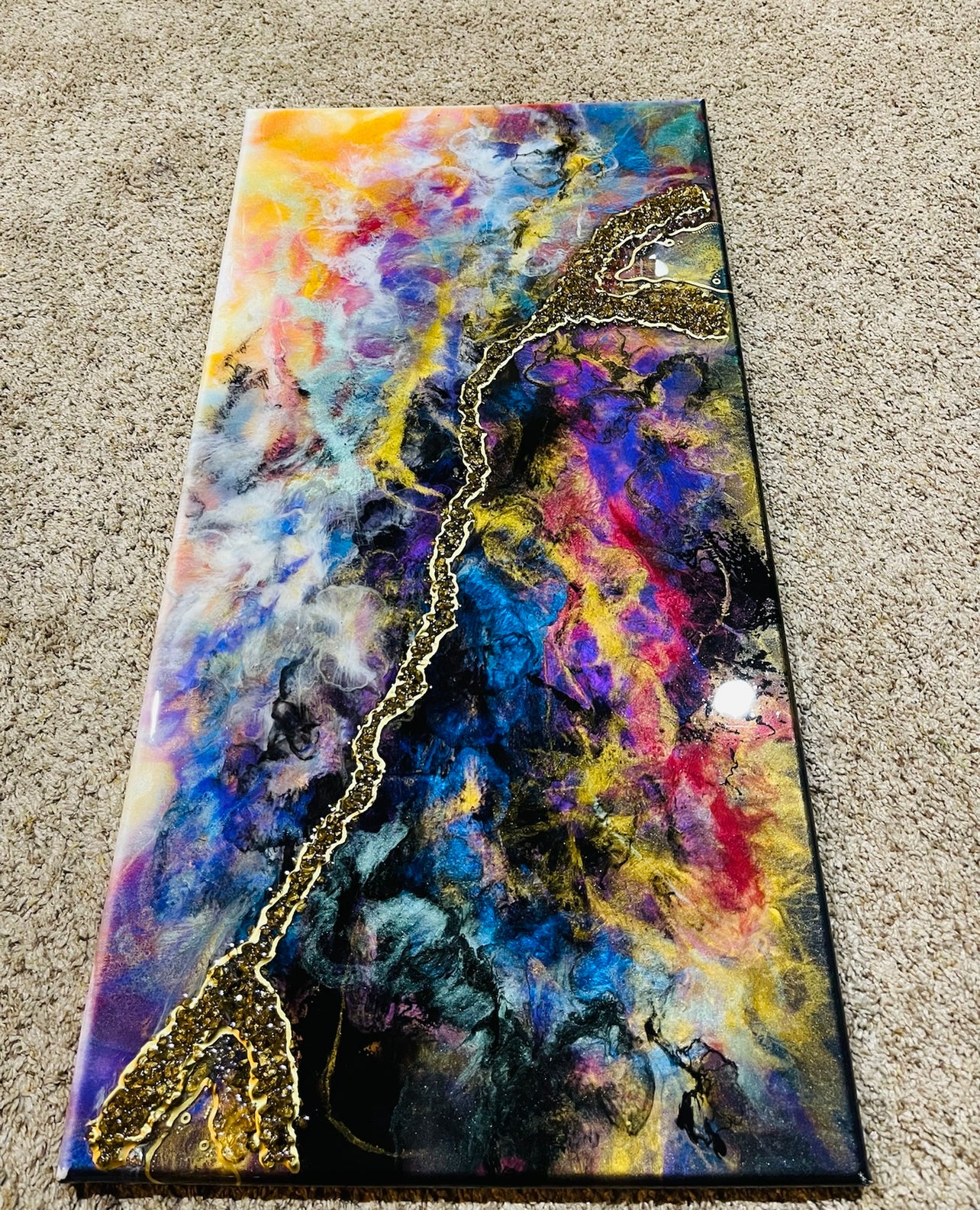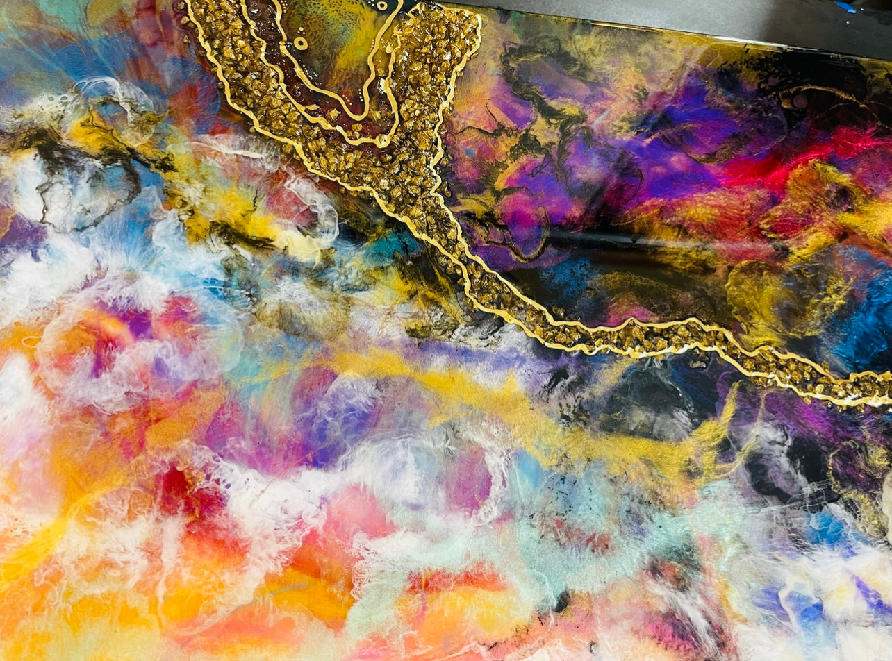 A 15x30 inch dirty resin pour. This piece has many layers of pigmented/colored resin, creating unique depth and detail. Textured and detailed further with broken stones/glass and gold ink. This vibrant piece will add a fun spark in your space.
