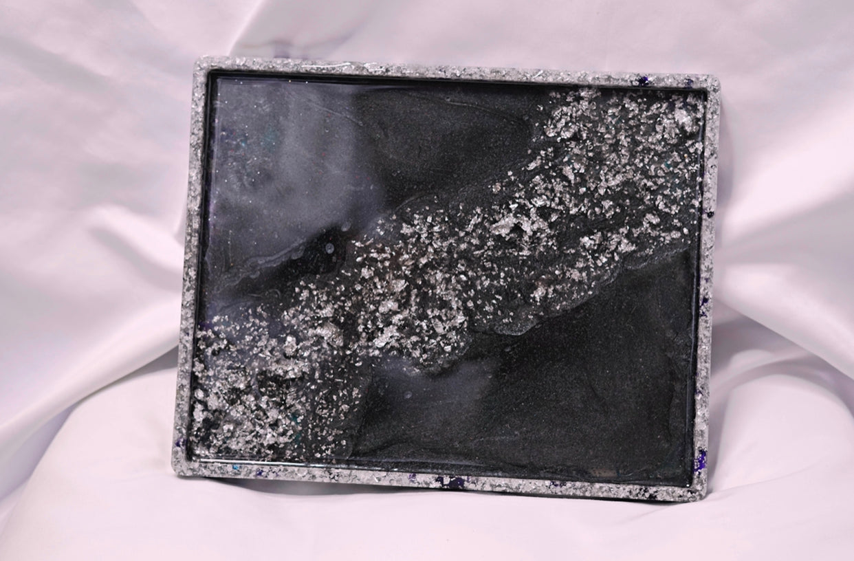 Handmade resin trays. Approximately 8x10 inches in size. Each tray is made completely out of pigmented resin. Each with their own unique look, color and design. Sold individually.